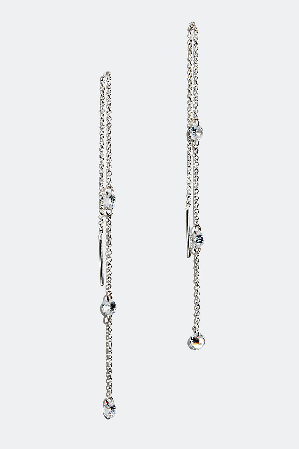 Lenkeøredobber i metall med tre dekorative glassteiner. Et par stilrene trekk-gjennom-øredobber som passer til alle anledninger. Øredobben tres gjennom hullet i øret slik at lenken henger på både for- og baksiden av øreflippen, men kan også tres gjennom to hull i samme øre.