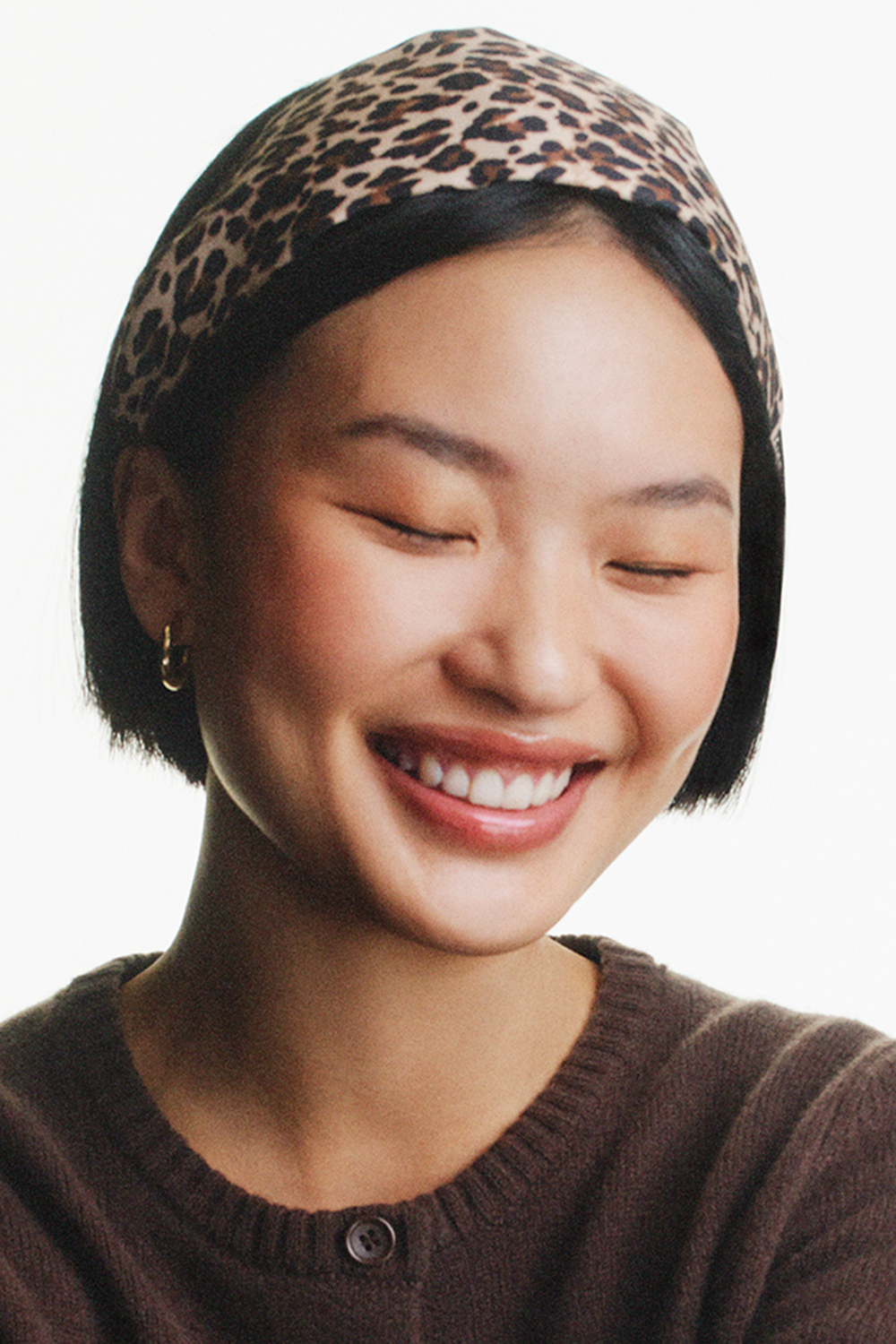 Bred hårbøyle i leopardstoff med tagger på innsiden som holder den på plass.