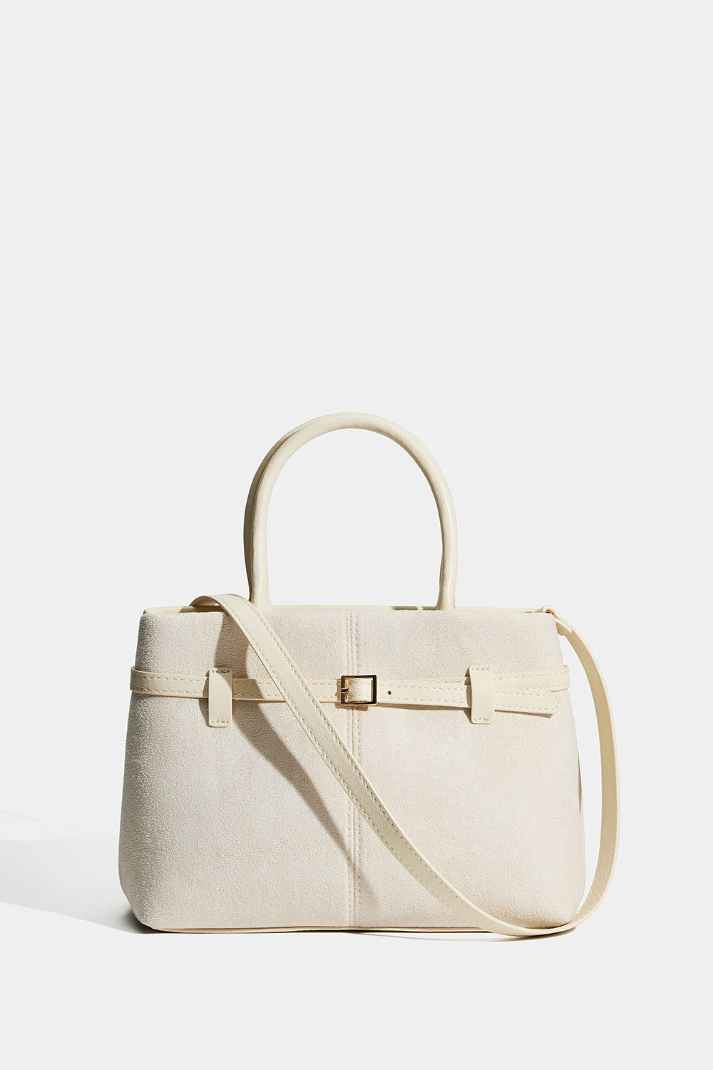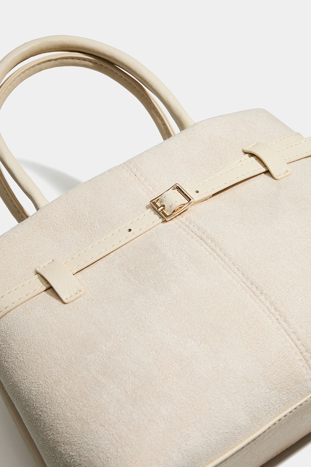 Liten, beige, rektangulær veske i semsket skinn og imitert skinn med et smalt belte rundt. Vesken har et større rom som lukkes med magnet og et mindre rom med glidelås inni. Den følger med justerbar skulderrem.