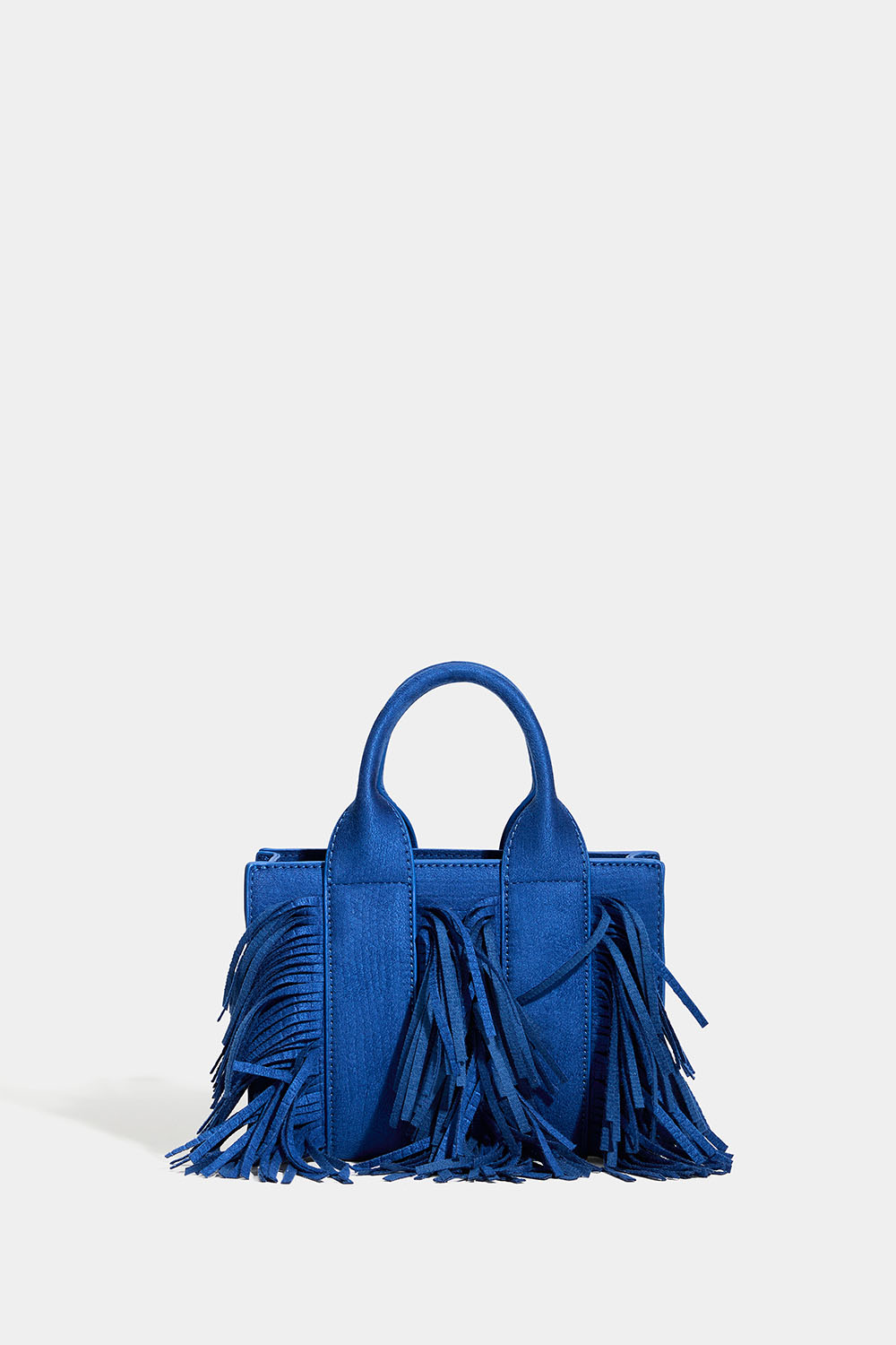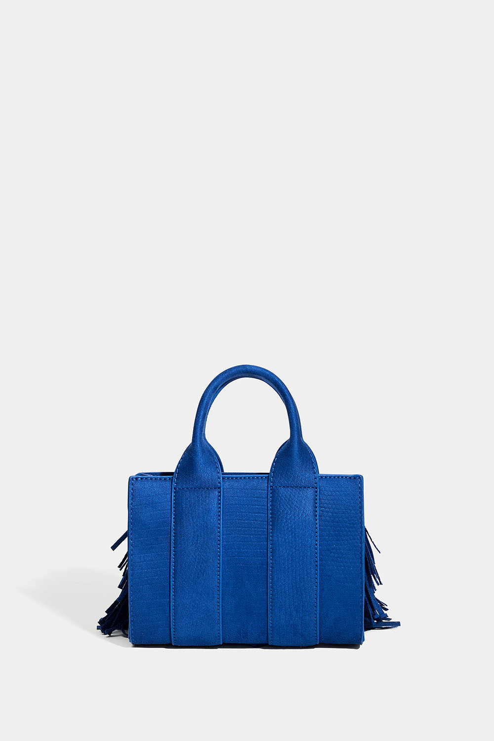 Liten blå veske med to håndtak, frynser i imitert semsket skinn og et diskret slangeskinnsmønster. Leveres også med en avtakbar skulderrem slik at du kan ha vesken over skulderen eller på skrå over magen.
