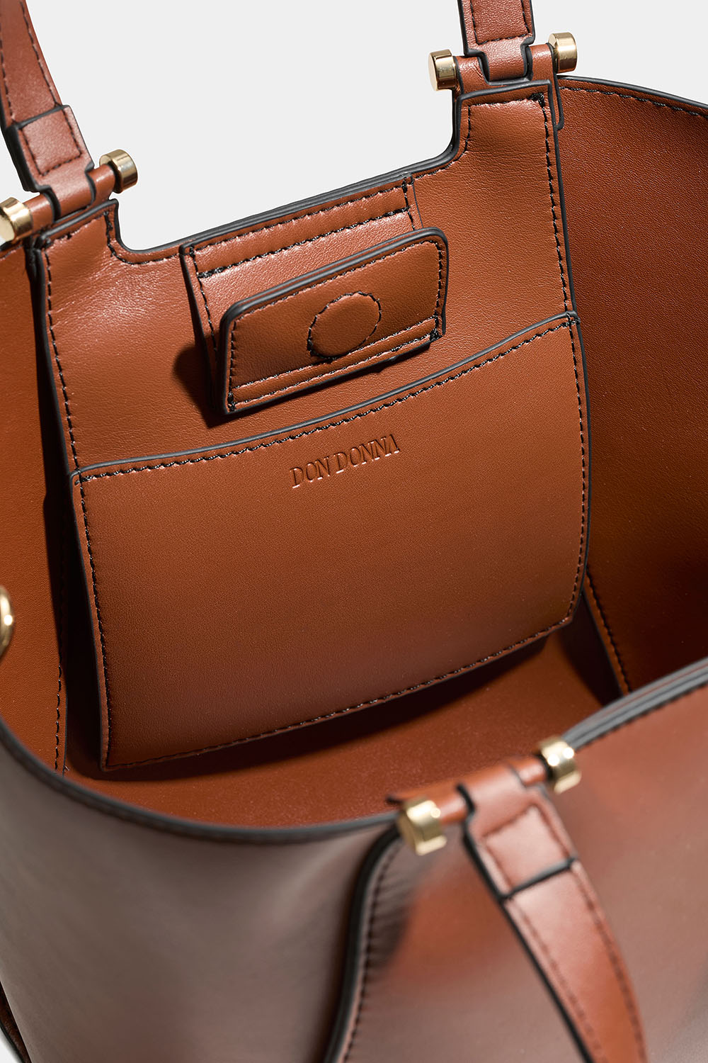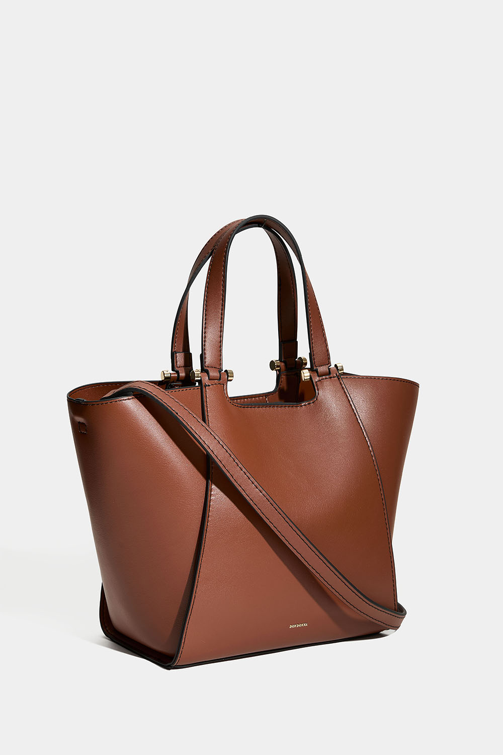 Liten brun tote bag fra Don Donna i imitert skinn. En stilig veske med doble, smale håndtak og en avtakbar, lengre skulderrem. Vesken har et stort rom, slik at du kan velge å klikke sidene av vesken sammen for en smalere passform.