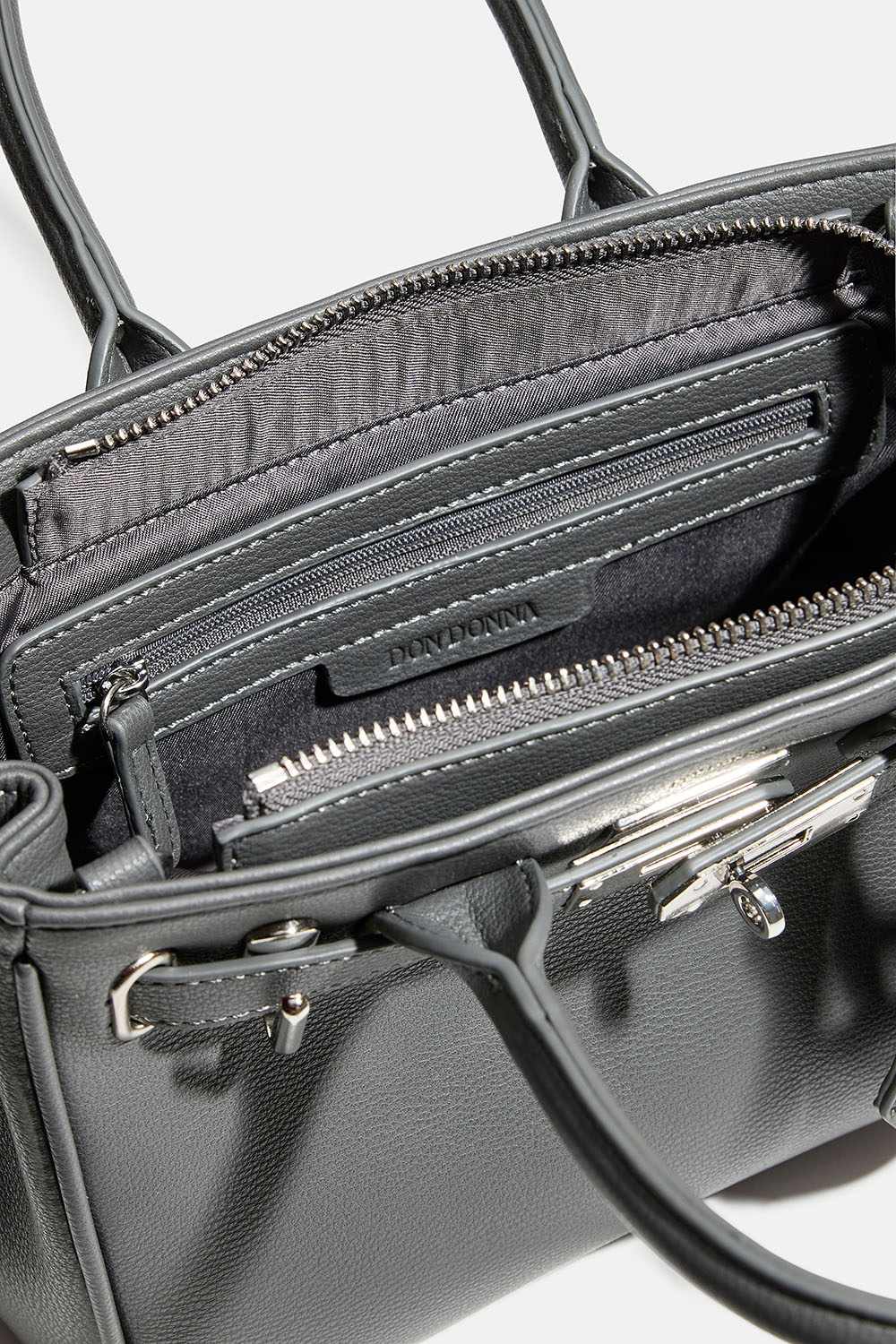 Liten handleveske i sort imitert skinn med beltedetalj. Vesken har et stort rom med glidelås og to mindre på innsiden. Det følger med en nøkkelring og en justerbar skulderrem.