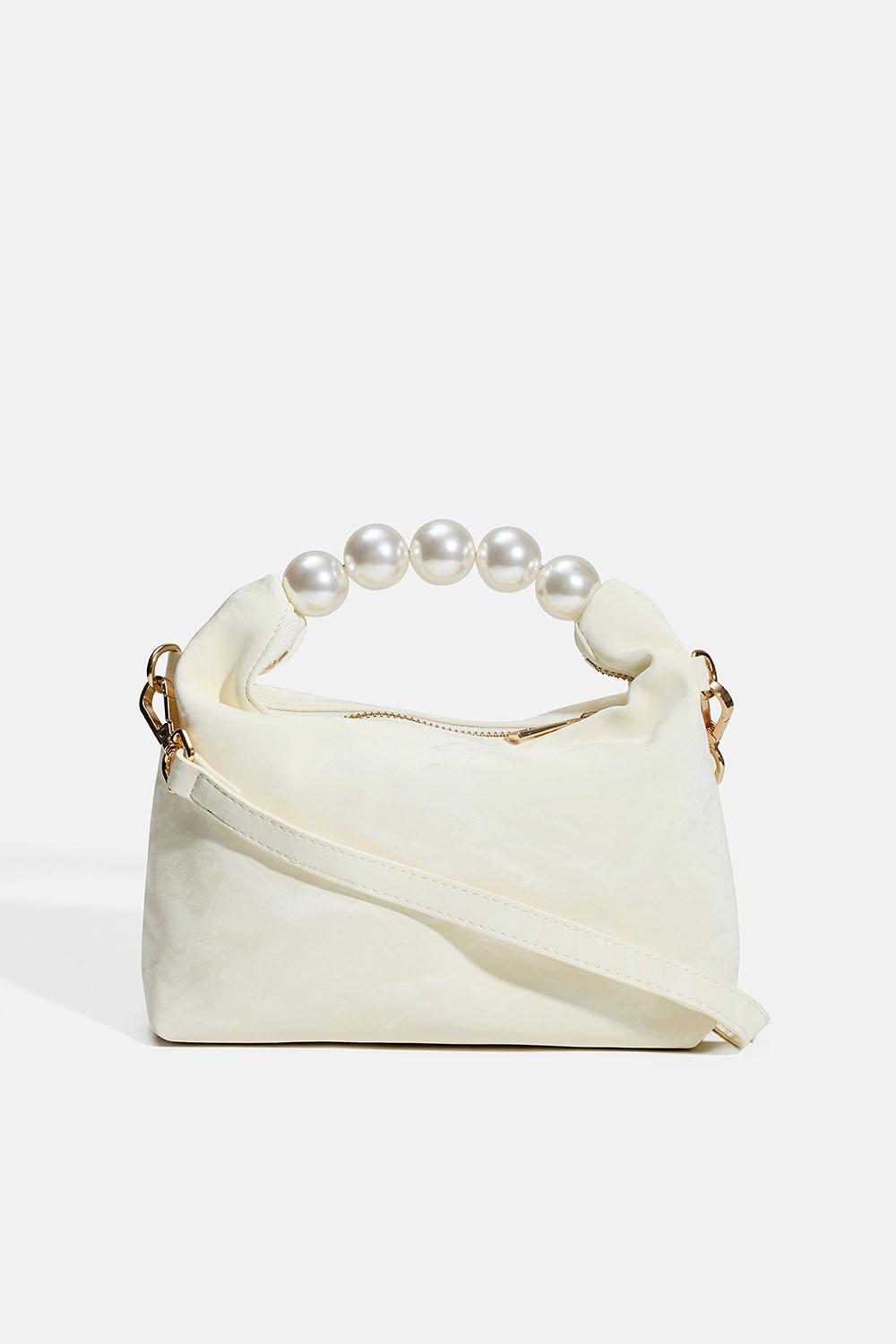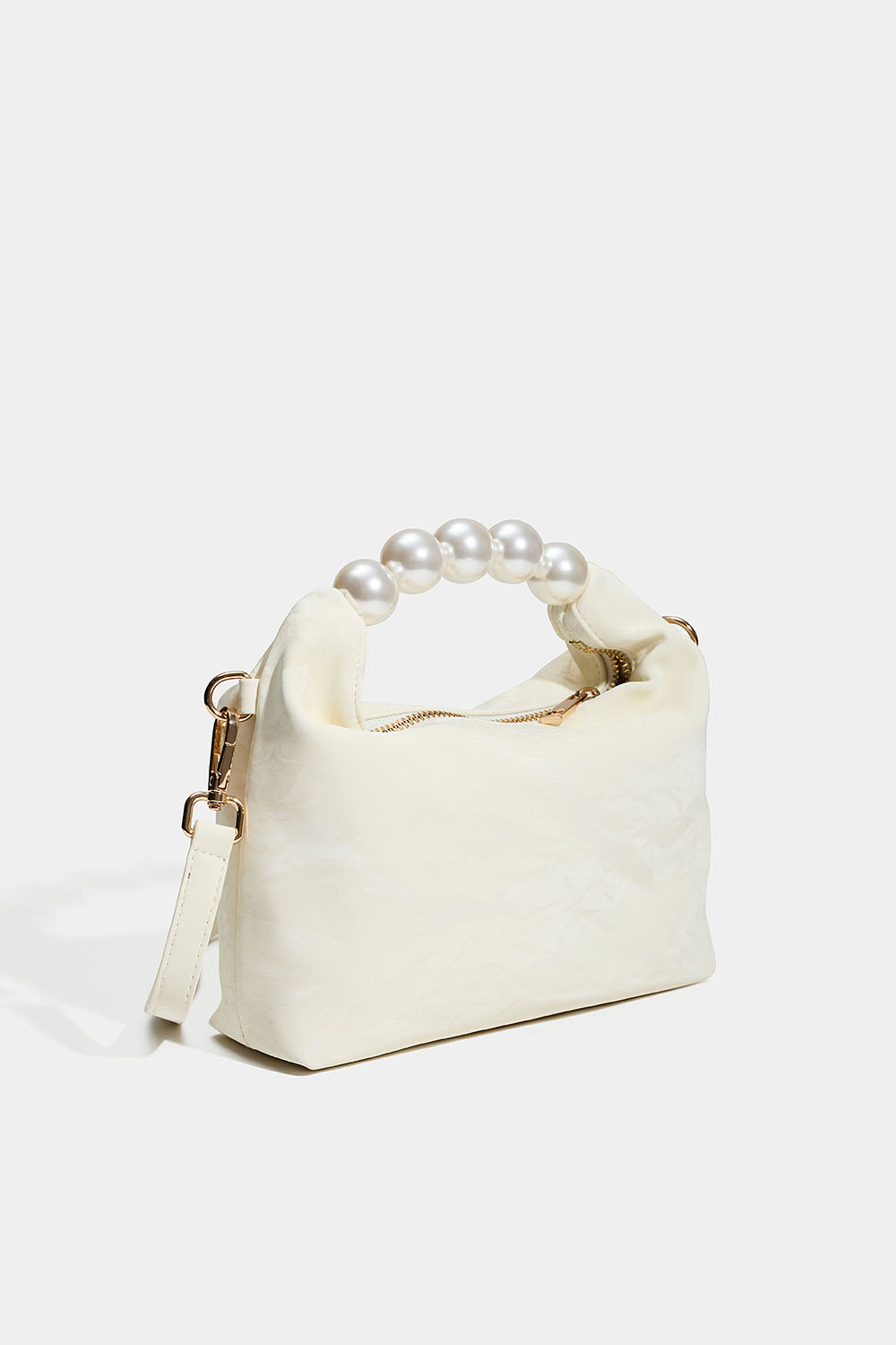 Liten veske i lett marmorert, skimrende materiale med hank bestående av fem store hvite perler. Vesken lukkes med glidelås og leveres med en justerbar skulderrem.