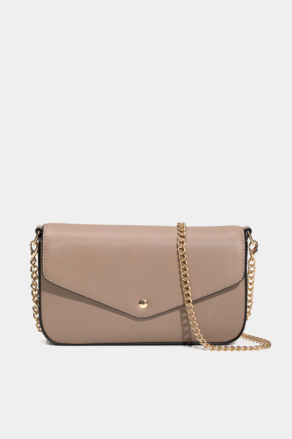 Liten, taupefarget veske fra Don Donna med konvoluttlukking. Den har innerlomme med glidelås og et avtakbart skulderkjede, slik at den kan bæres crossbody.