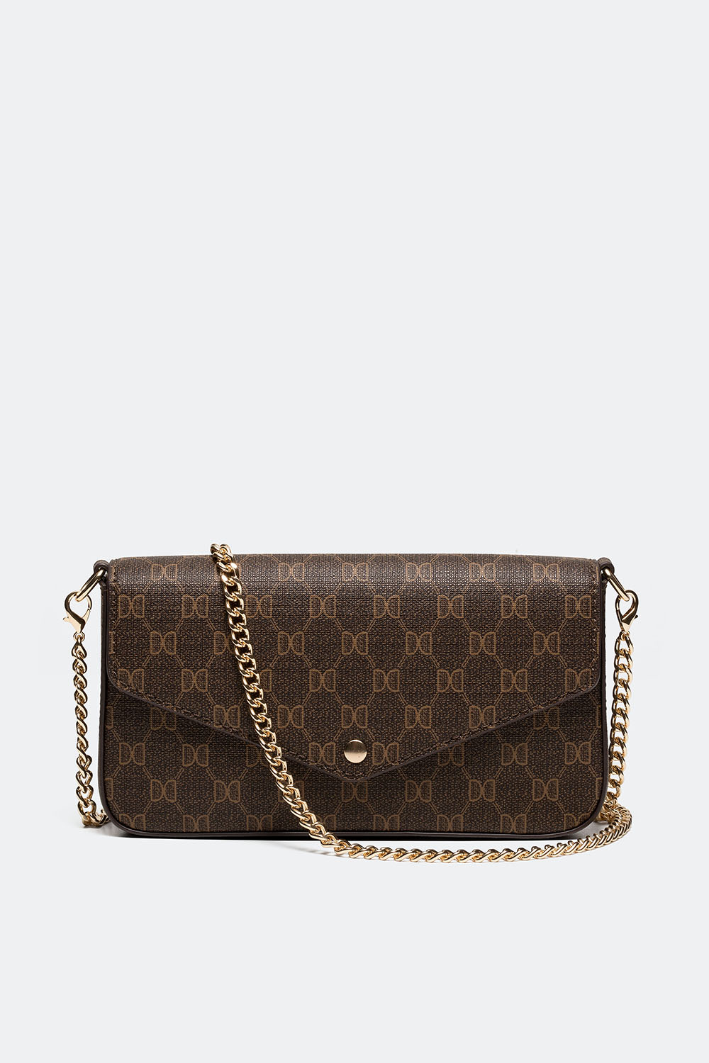 Liten brun veske med trykt Don Donna-logo og et avtakbart skulderremkjede. En tidløs veske i perfekt størrelse med plass til det viktigste du må ha med deg.