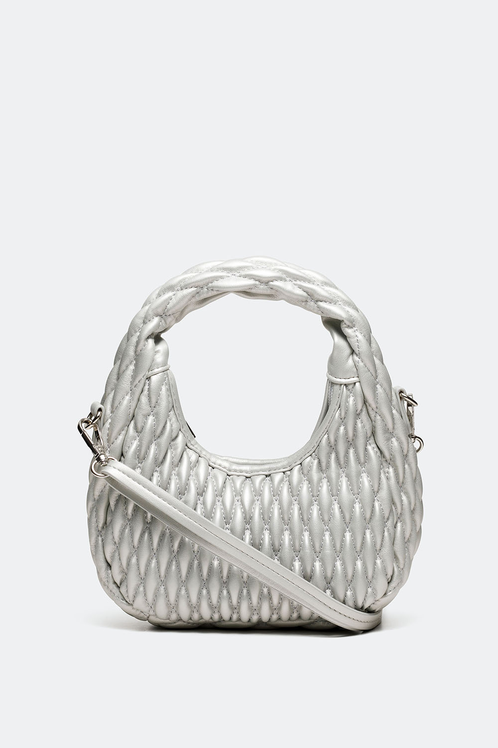 Liten sølvfarget, quiltet veske i kunstskinn med håndtak på toppen og justerbar skulderrem. En dekorativ veske som setter et flott preg på antrekket ditt og passer perfekt til fest. Skulderremmen er justerbar, slik at du kan bære den på flere ulike måter.