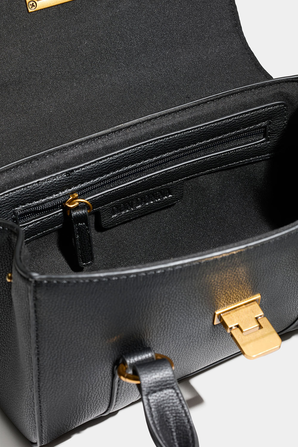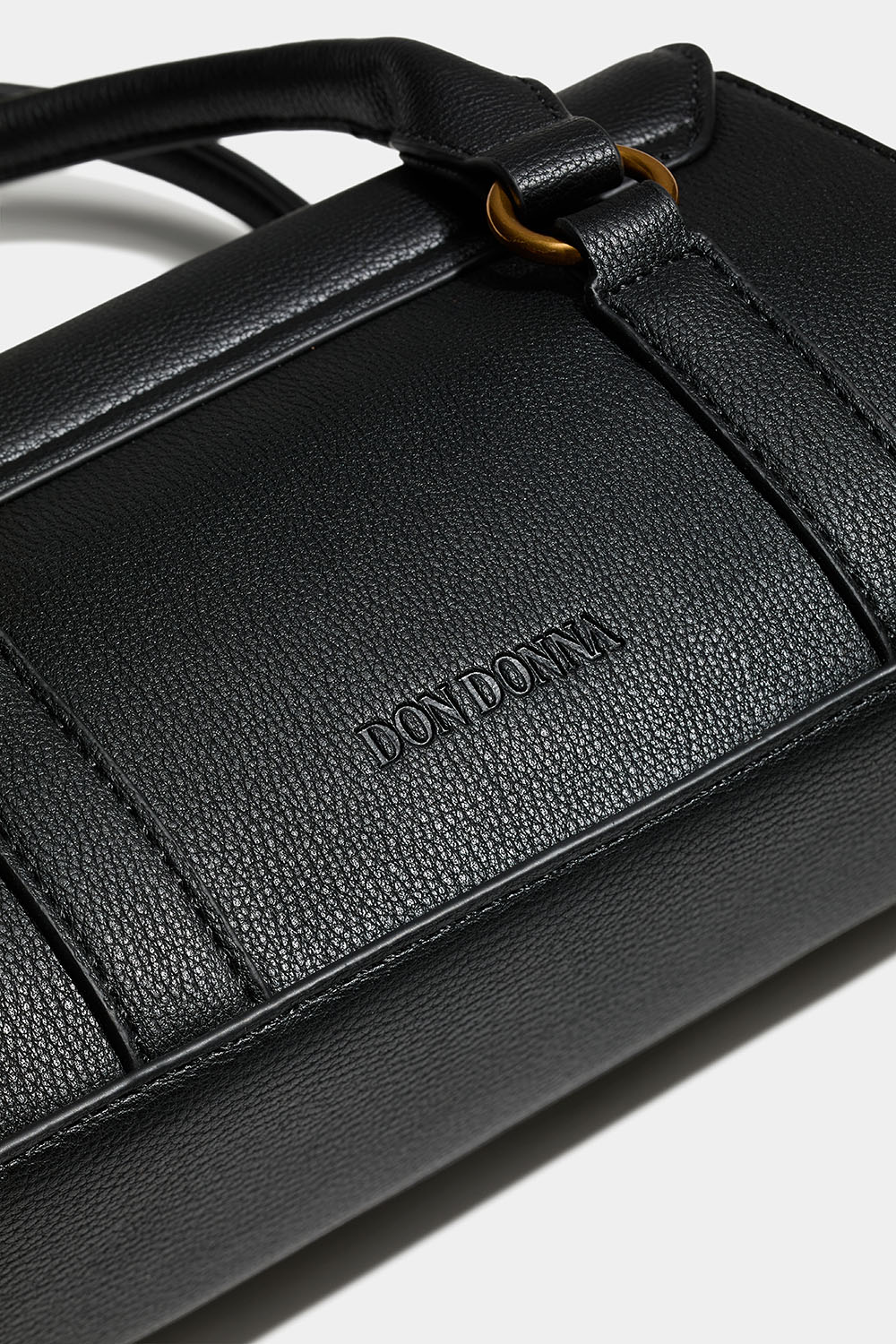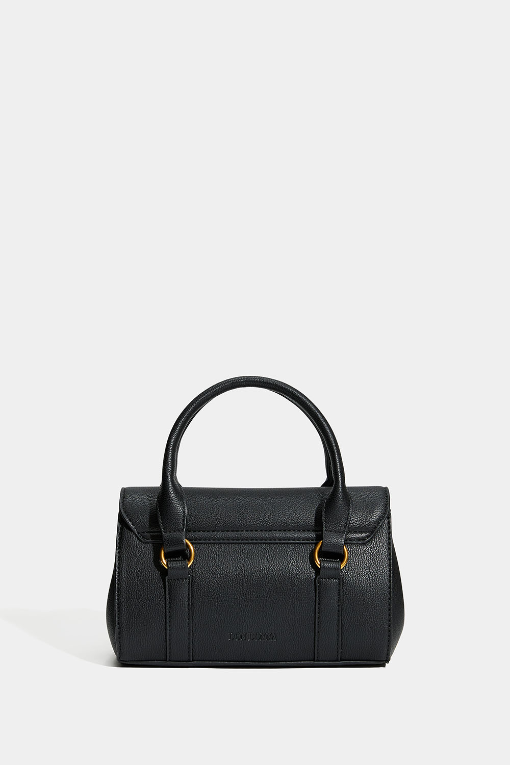 Liten svart veske fra Don Donna i imitert skinn med Don Donna-logoen preget på baksiden og detaljer i matt gullfarget metall. Det medfølger også en lengre skulderrem, slik at du også kan bruke vesken på tvers.