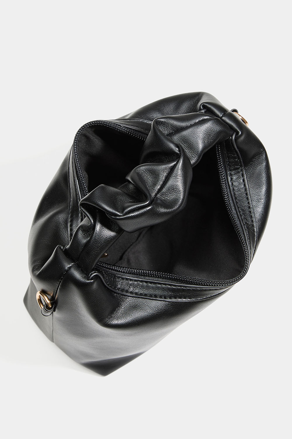 Liten veske i sort kunstskinn med rynket håndtak. Vesken lukkes med glidelås og har en justerbar skulderstropp.