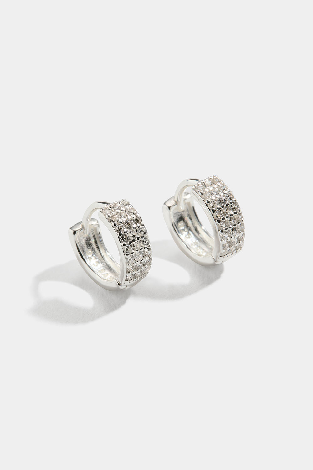 Minihoops i ekte sølv med små Cubic Zirconia-steiner langs forsiden i tre rader.