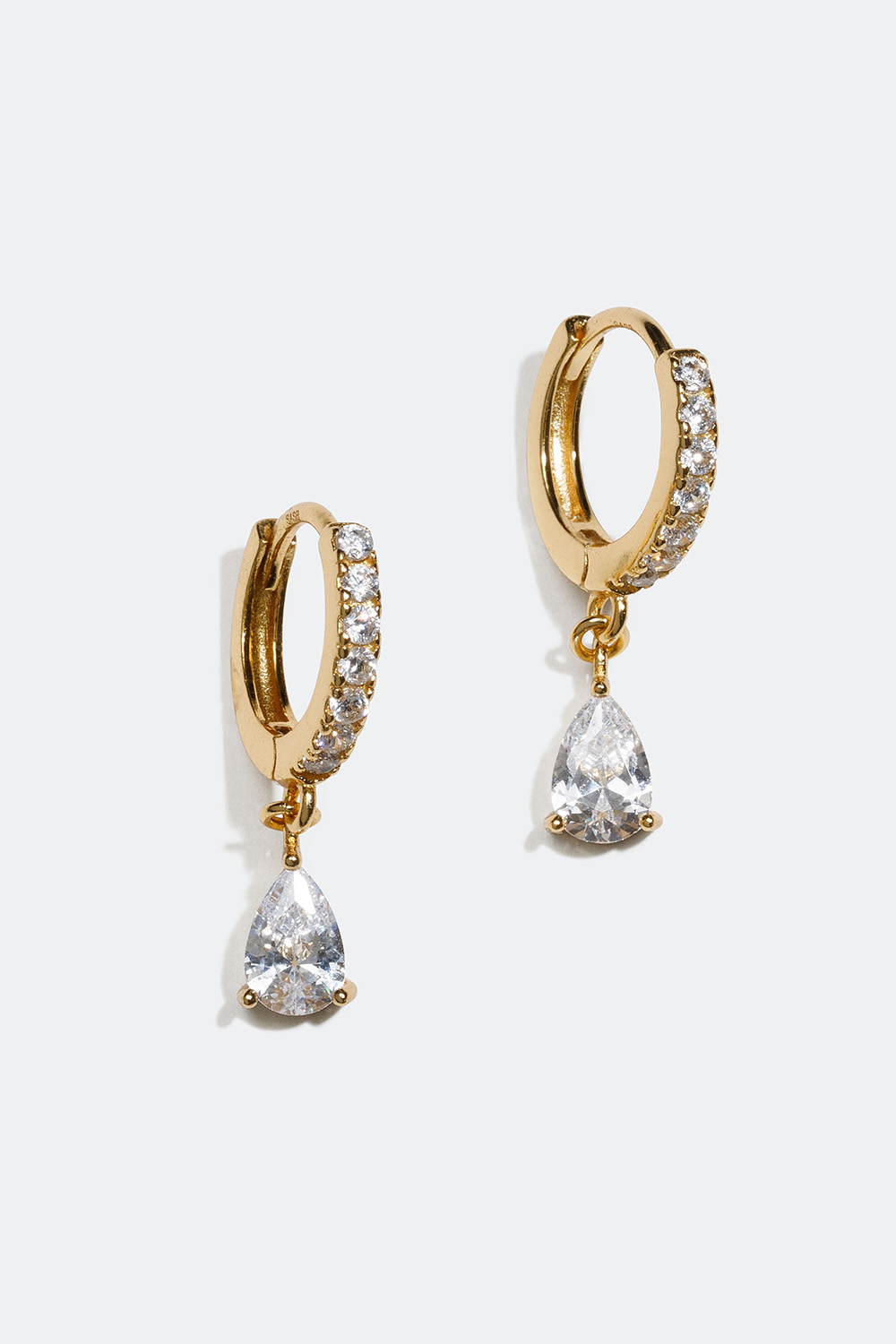 Miniøreringer i ekte sølv forgylt med 18 k gull med klare Cubic Zirconia-steiner foran og dråpeformede anheng av hvite Cubic Zirconia-steiner. Et par dekorative øredobber med elegant design som bidrar med både skimmer og farge til looken din og passer perfekt til fest.