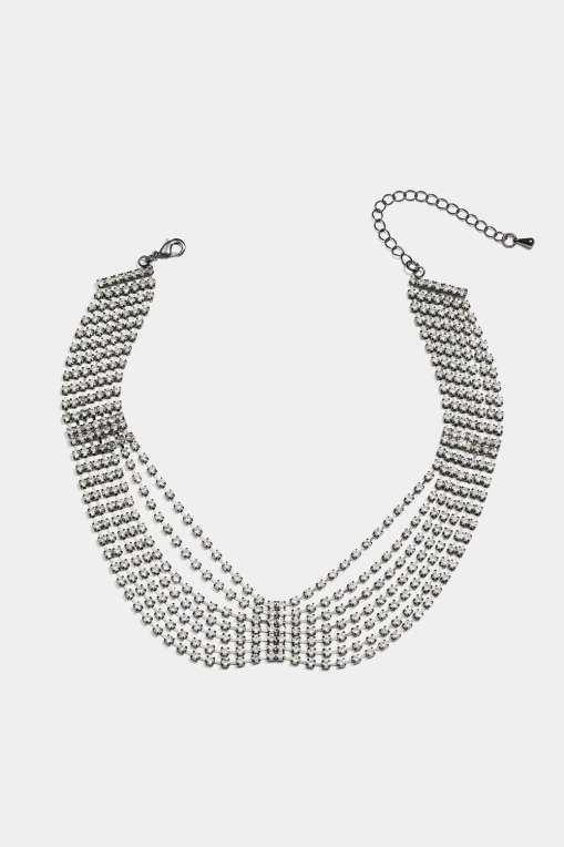 Choker-kjede i grå pistolmetallfarge dekorert med små hvite glassteiner.