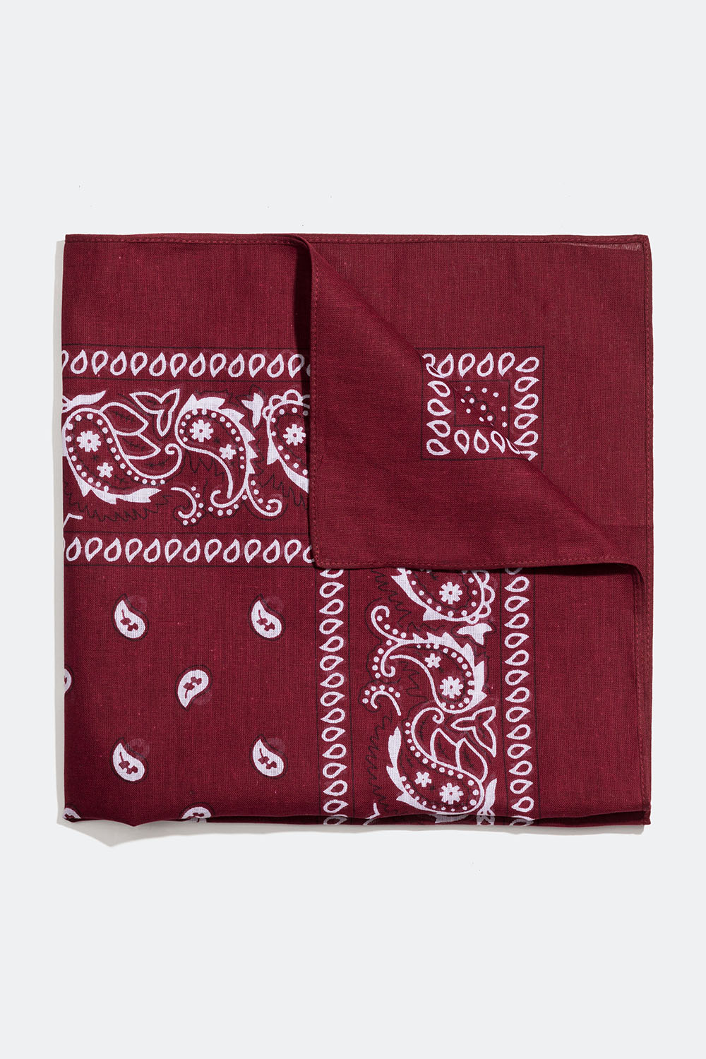 Mørkerødt skjerf laget av bomull, som er dekorert med et klassisk paisleymønster, som kan knyttes rundt halsen eller i håret.