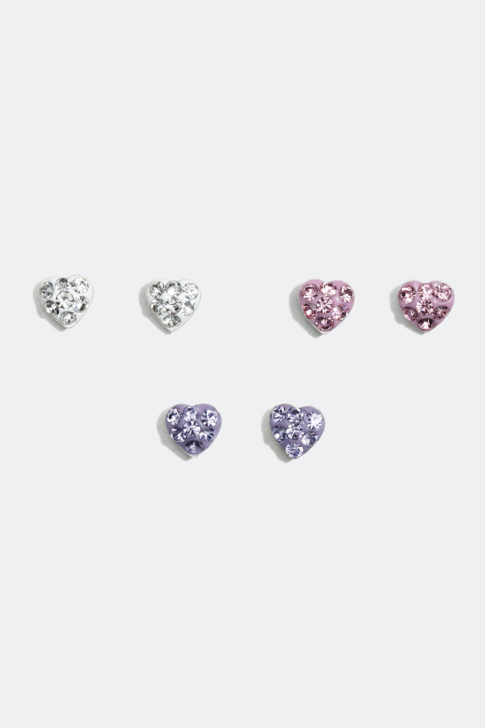 Ekte sølvøreringer til barn i multipakning. Tre par øreringer i lilla, rosa og sølv med glassstein i form av hjerter.