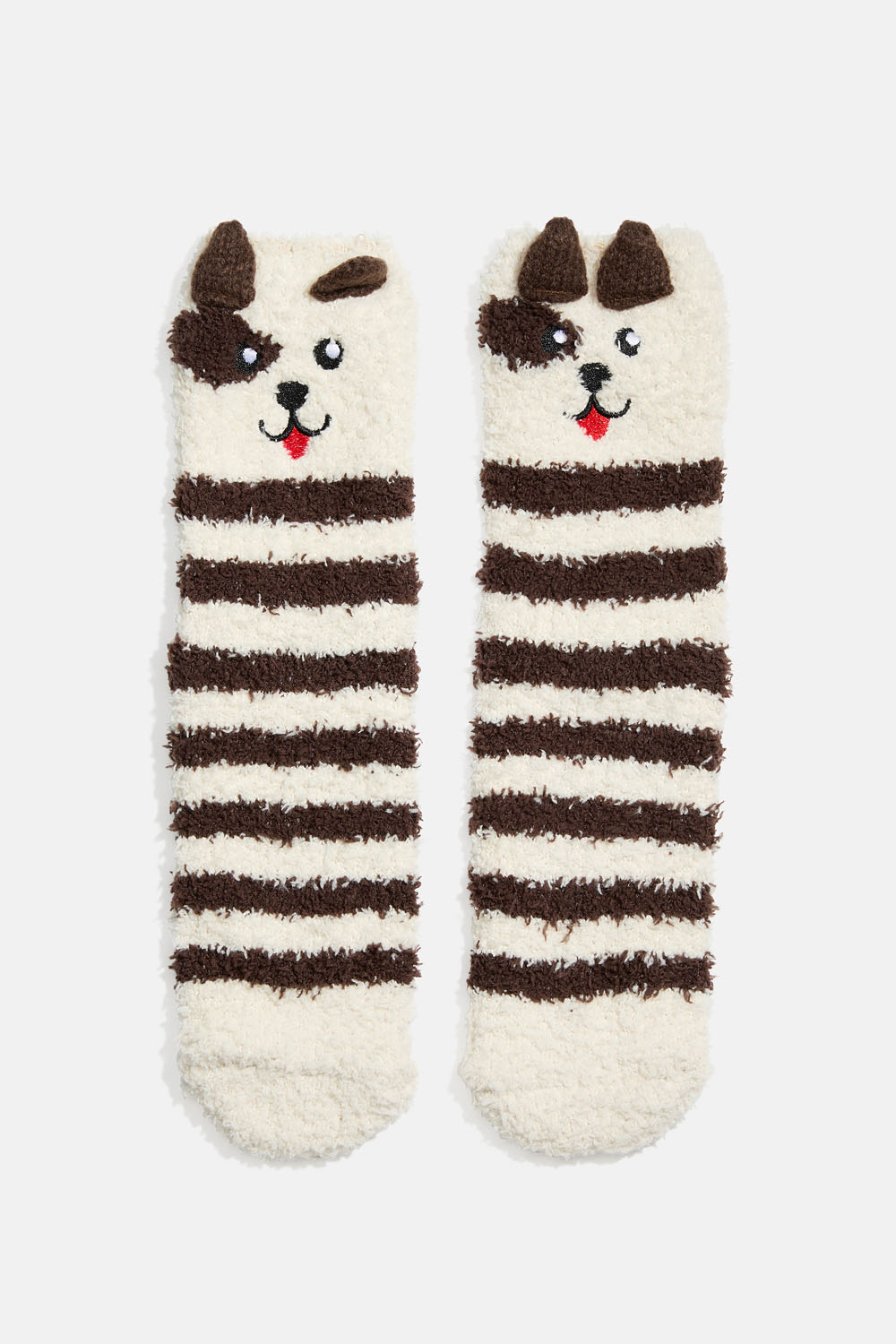 Myke beige- og brunstripete sokker med brodert hund og utstrikkede ører. Varme sokker som passer alle.