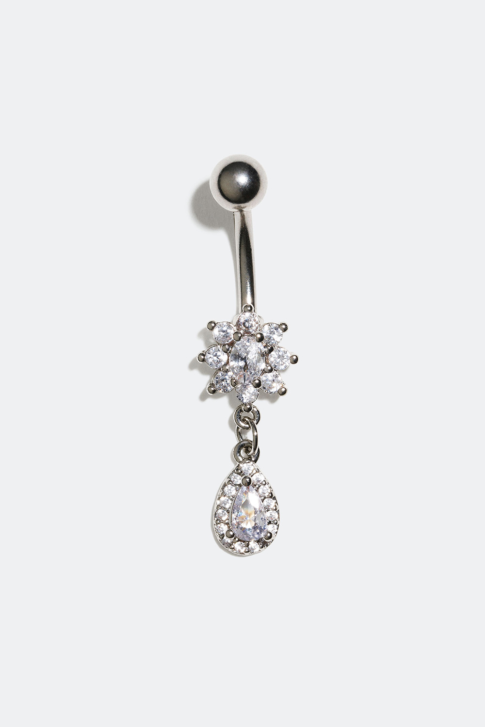 Navlepiercing av kirurgisk stål med en blomst som er utsmykket med Cubic Zirconia-steiner samt et dråpeformet anheng med Cubic Zirconia-steiner. Et glitrende navlesmykke med dekorativt anheng. Piercingstangen og kulen er laget av kirurgisk stål og anhenget er av messing.