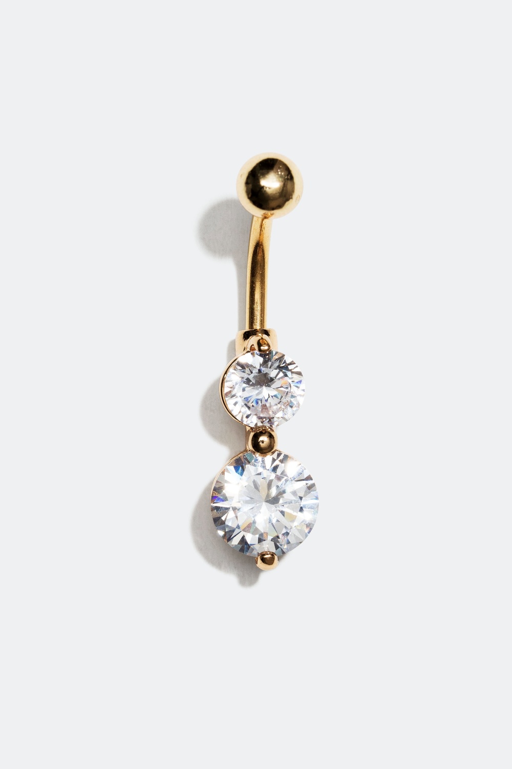 Gyllen navlepiercing med to dekorative steiner av glass. Piercingstaven og kulen er laget av kirurgisk stål, og anhenget er i messing.