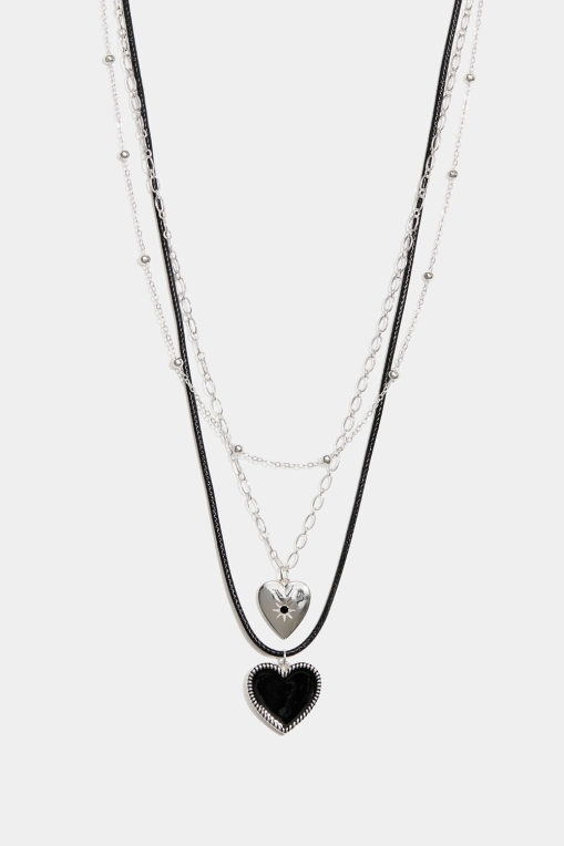 Halskjede med to kjeder og sort snor med hengende hjerter.