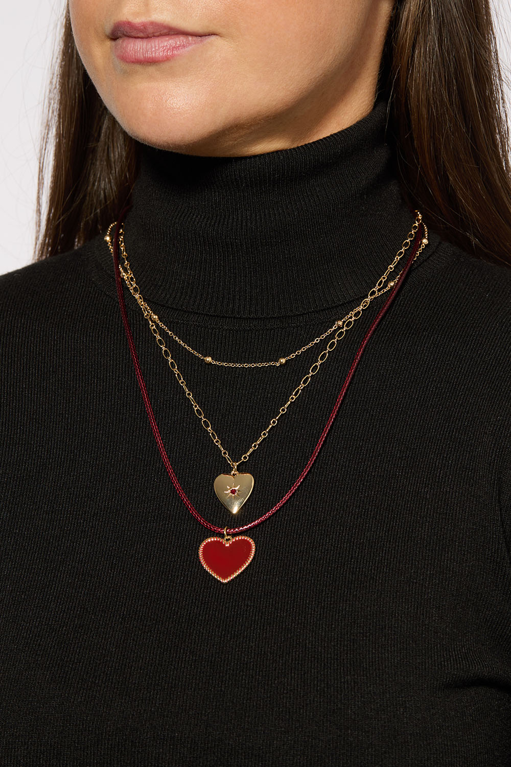 Trippel halskjede med hjerter og snor