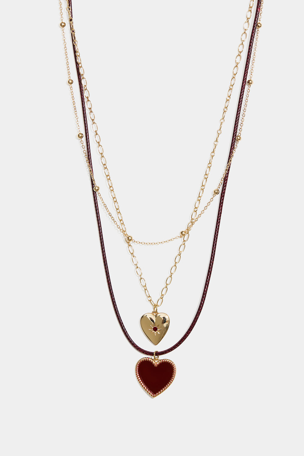 Halskjede med to kjeder og burgunderfarget snor med hengende hjerter.