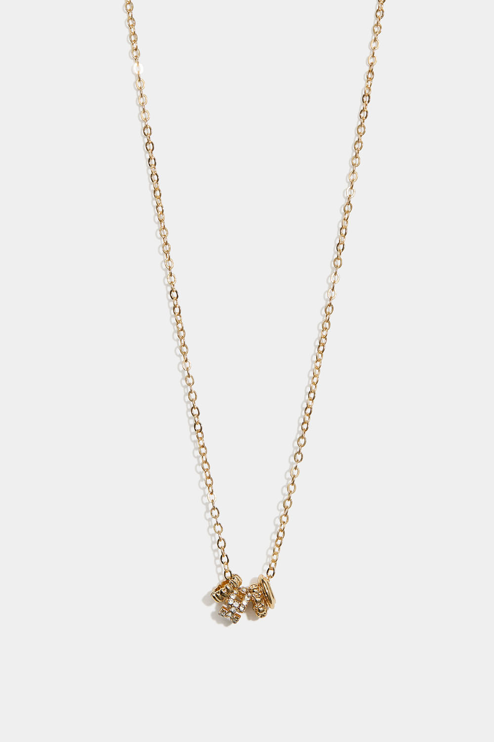 Tynt halskjede i gullfarget metall med fire, små, runde anheng og strass.