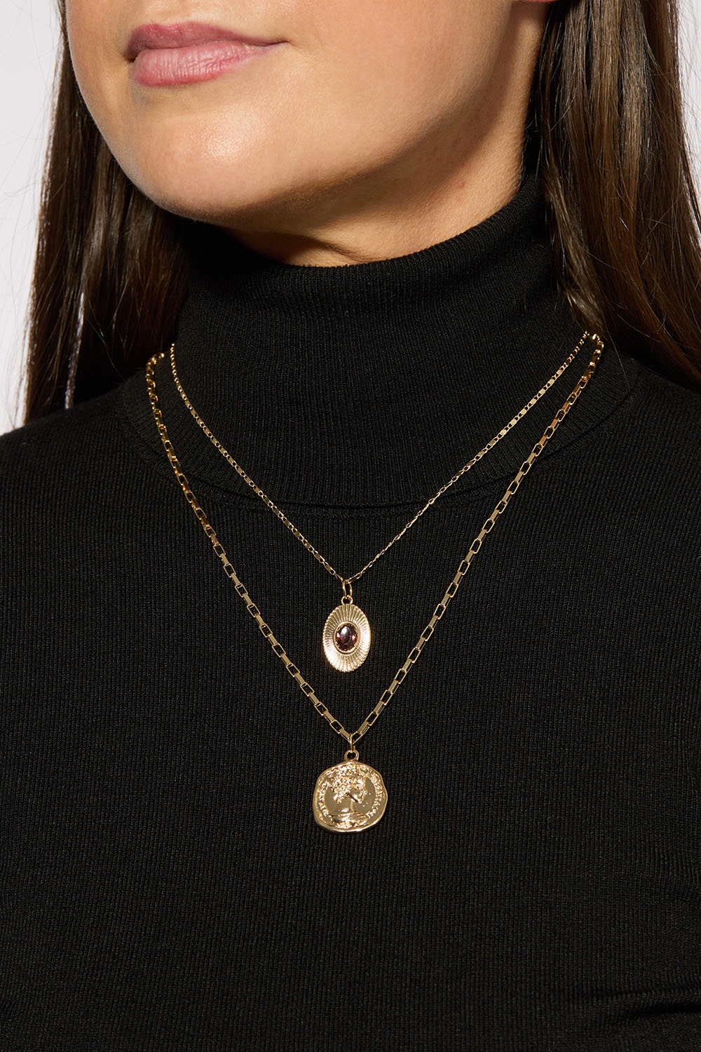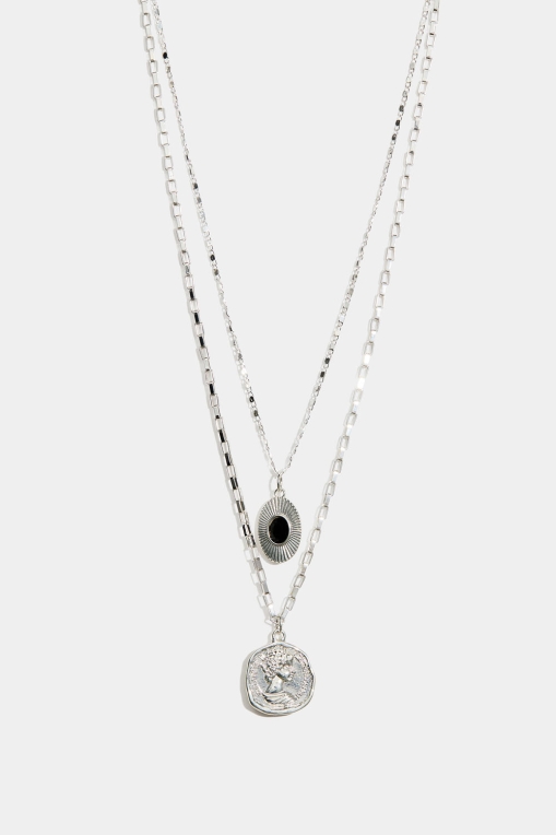 Dobbelt halskjede med to hengende charms. En med myntmotiv og en oval med sort sten i harpiks.