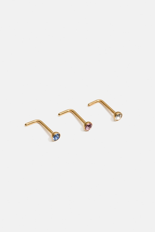 Nesepiercing i gullfarget stål med steiner, 3-pakning