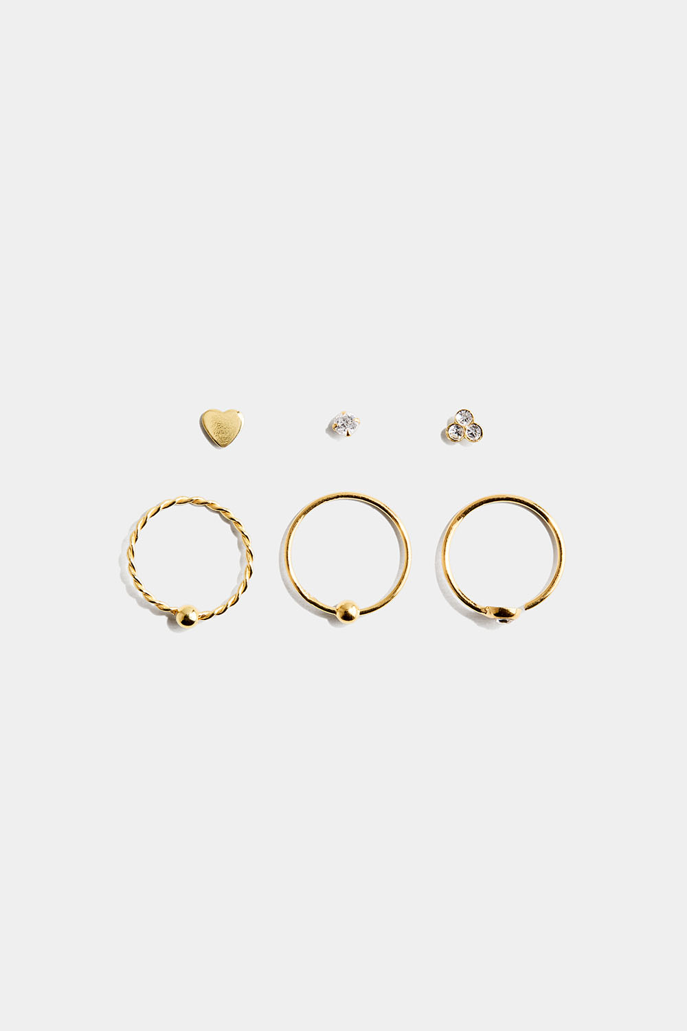 6 stk. nesepiercinger i 18k forgylt ekte sølv. Tre på pinne og tre runde. Tre av piercingene har små, hvite glassteiner, en med hjerteform, en tvunnet, og en tradisjonell med en liten kule.