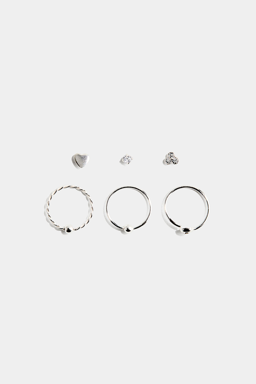 6 stk. nesepiercinger i ekte sølv. Tre på pinne og tre runde. Tre av piercingene har små, hvite glassteiner, en med hjerteform, en tvunnet, og en tradisjonell med en liten kule.
