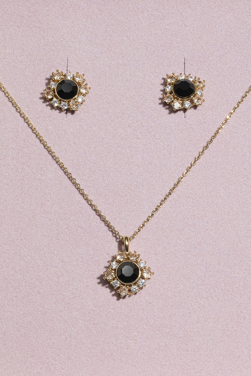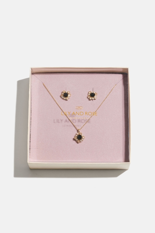 Emily halskjede og øredobber gløder av lys og er laget av en besnærende kullsvart krystall, som skaper en nydelig helhet med mindre mystiske opaler og klare krystaller. Innfattet i gull. Fullfør looken med andre smykker fra vår Emily-kolleksjon.