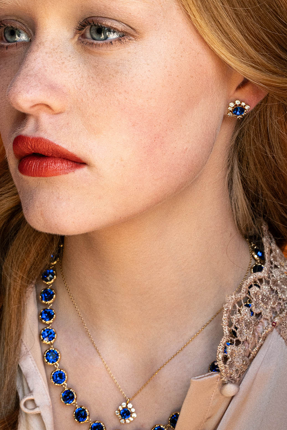 Emily-halskjedet vårt har en strålende blå stein og noen mindre, klare krystaller, som sammen utgjør en vakker komposisjon. Innfattet i gull. Kompletter antrekket ditt med andre smykker fra Emily-kolleksjonen vår.