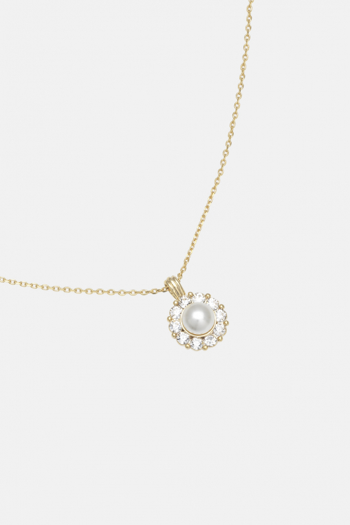 Det utsøkte designet gjør det virkelig allsidig og passende til enhver stil og anledning. Dette smykket har en delikat, tåkete perle i midten, omgitt av mindre, strålende klare krystaller på et gullkjede. En umiddelbar favoritt.