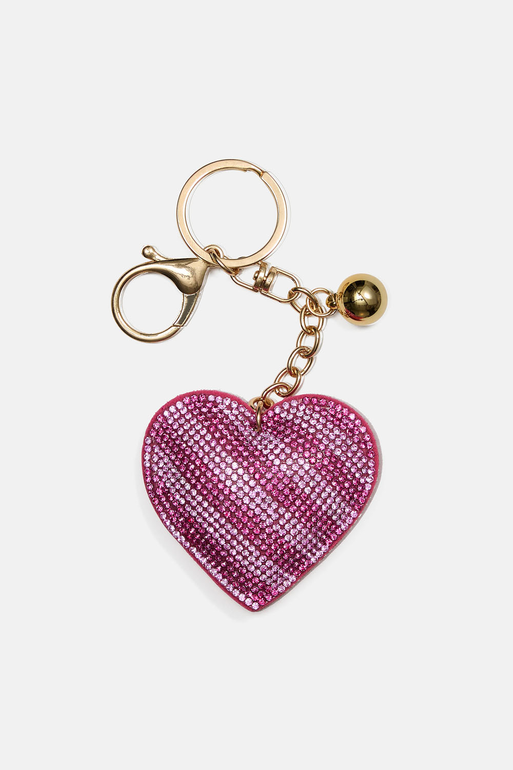 Nøkkelring med kjede i gullfarget metall med liten metallkule og rosa stoffhjerte dekorert med lyse og mørkerosa glasstener.