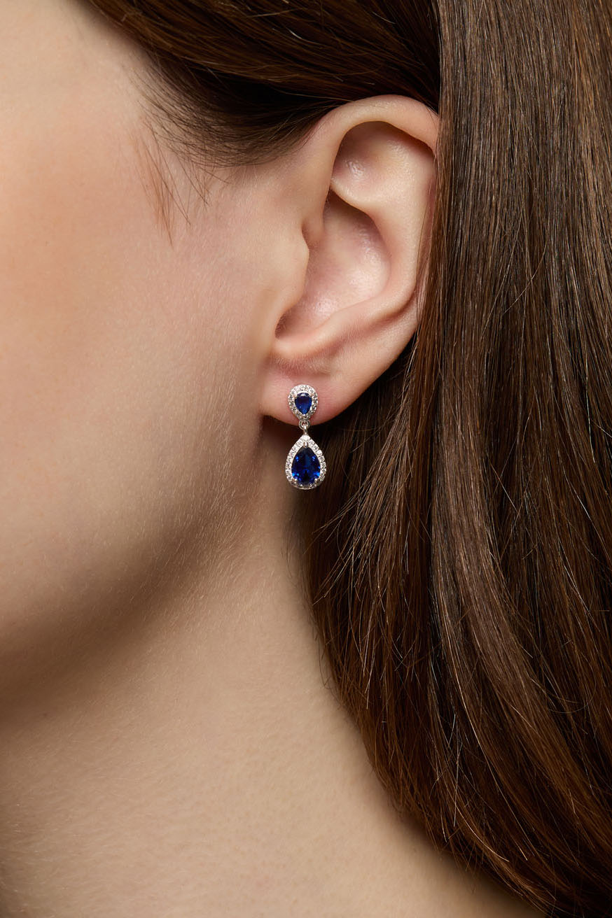 Øredobber i 18k ekte sølv med blå, dråpeformede kubisk zirkonia