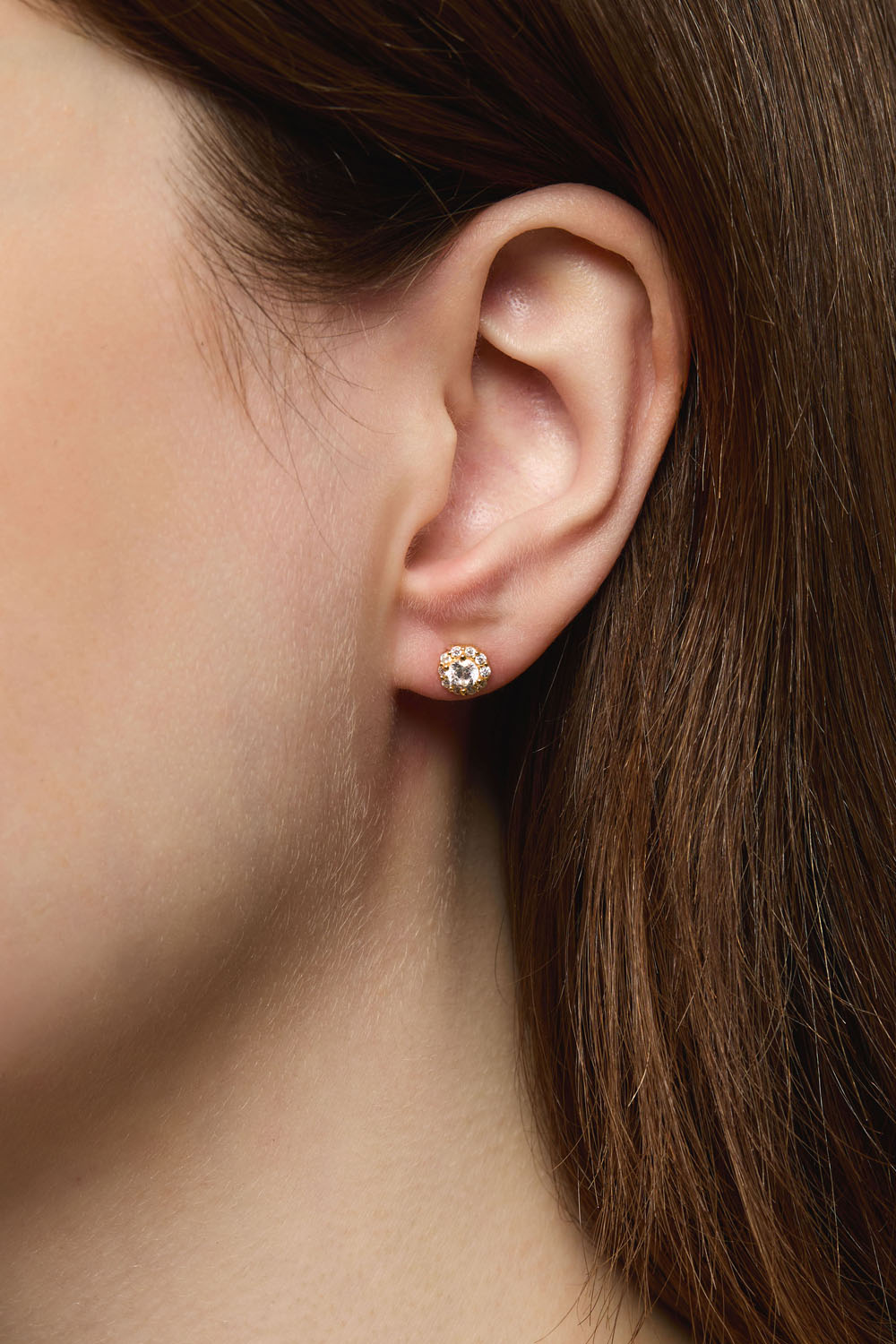 Små runde øredobber i 18k gullbelagt ekte sølv utsmykket med en større kubisk zirkonia-stein og små kubisk zirkonia-steiner plassert rundt. Et par enkle, men glitrende øredobber som passer til flere anledninger.