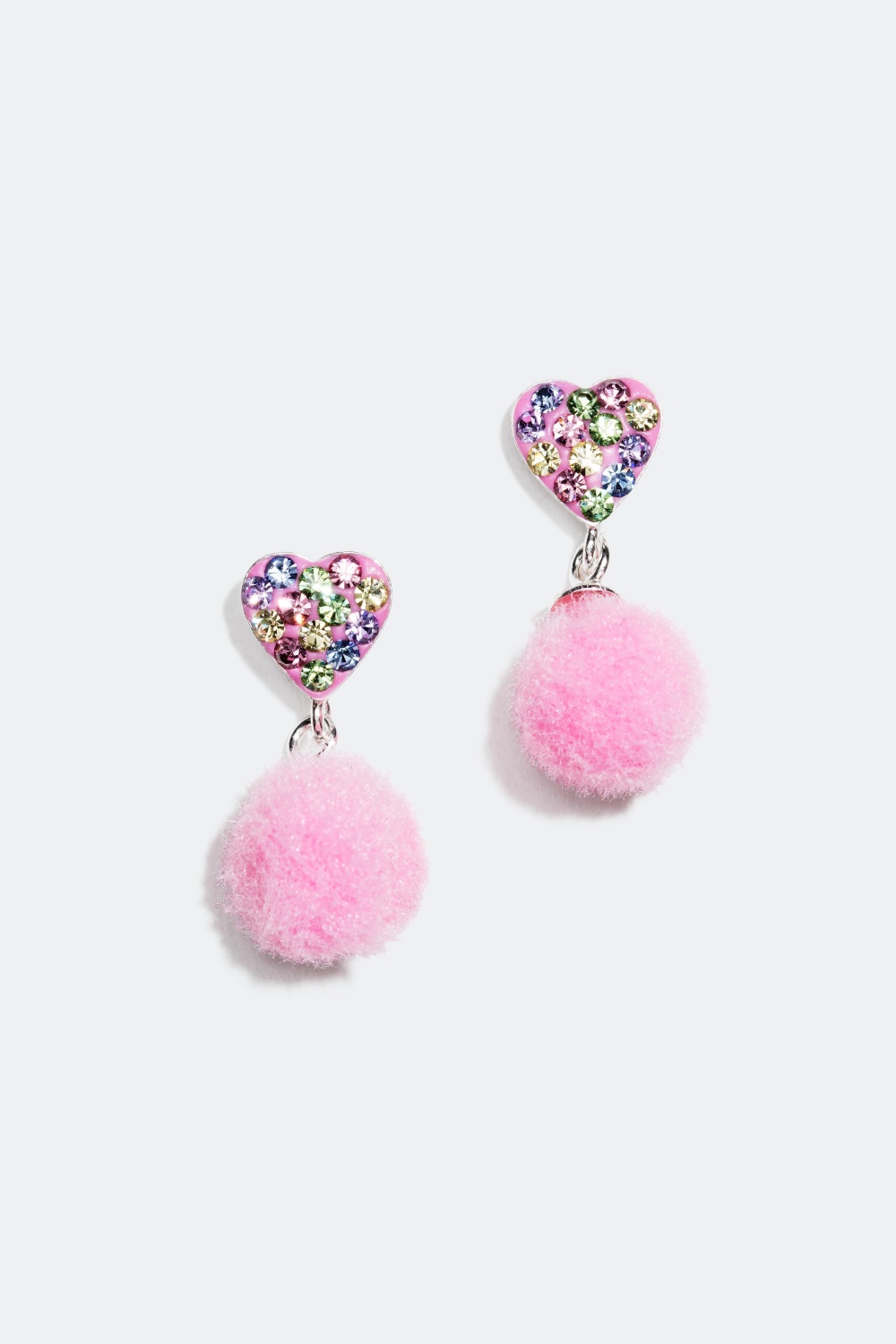Ekte sølvøredobber med hjerter dekorert med strassteiner i forskjellige farger og en rosa fluffy pompong.