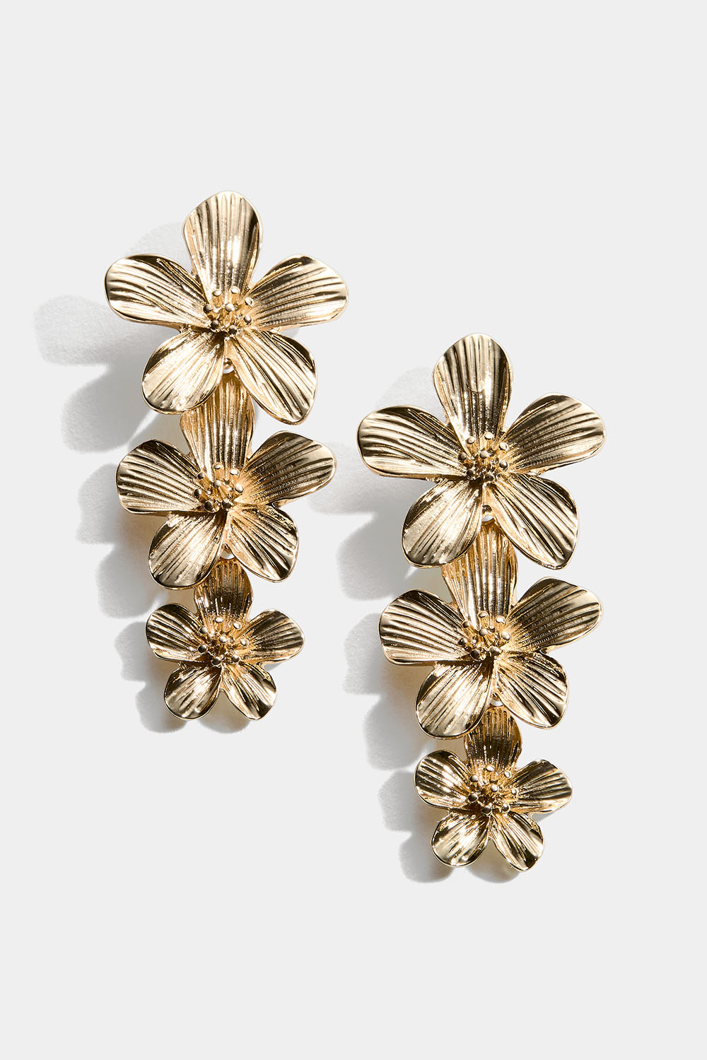 Gullfargede øredobber i metall med 3 hengende blomster.