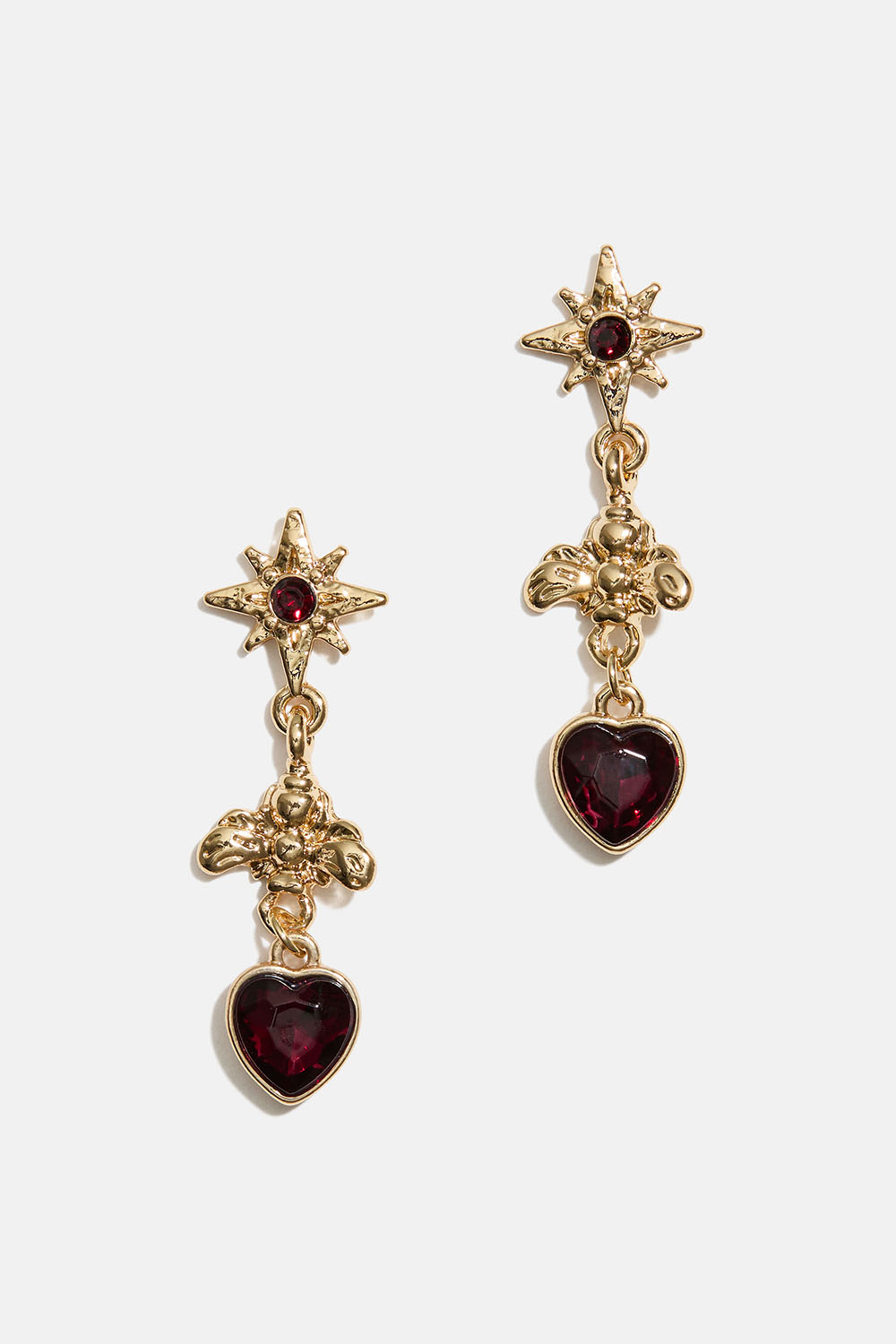 Øredobber i gullfarget metall med stjerner, bier og hjerter dekorert med røde glasstener.