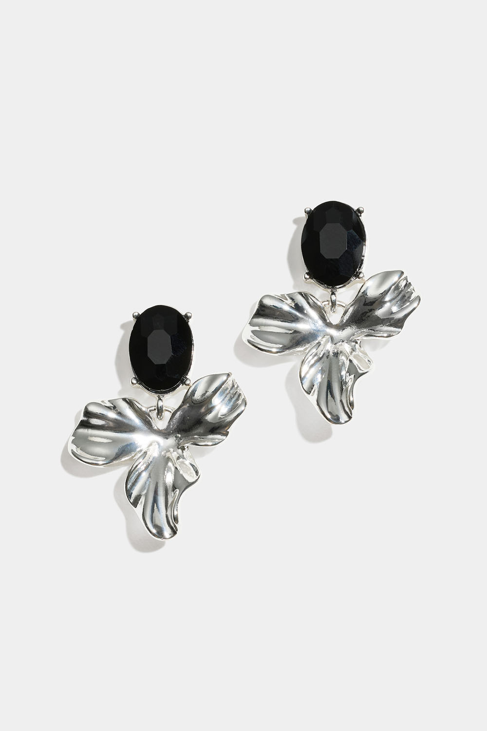 Øredobber med oval svart glasstein og hengende sølvfargede blader