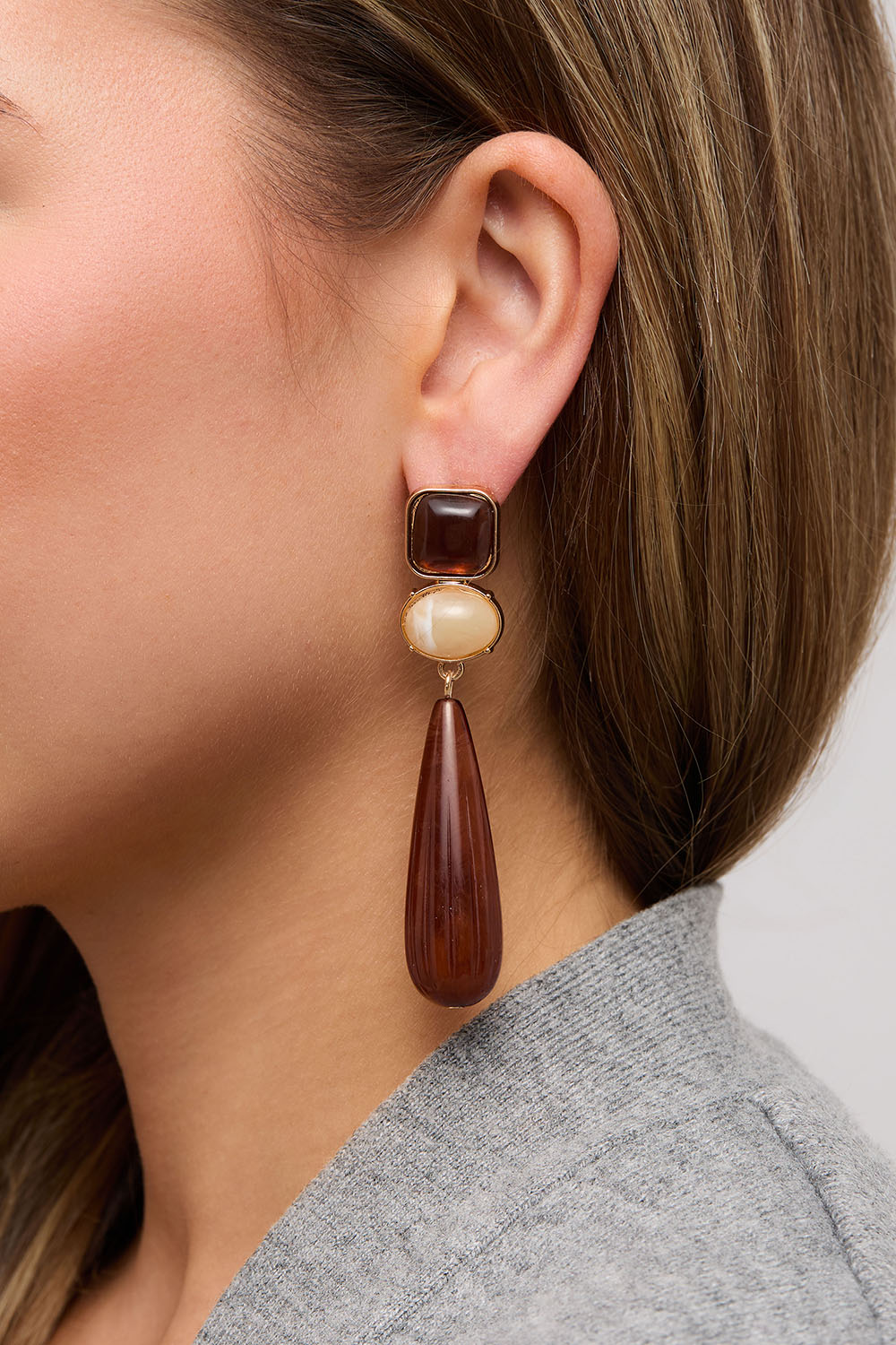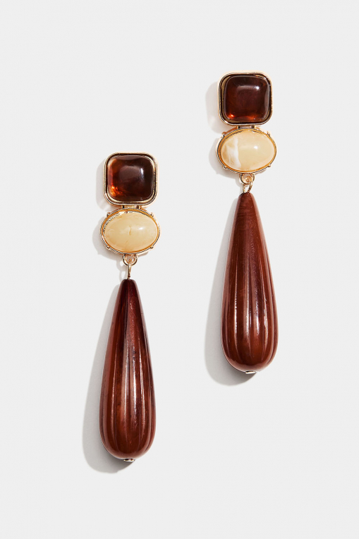 Øredobber i gullfarget metall med brune og beige harpiksstener i forskjellig form.