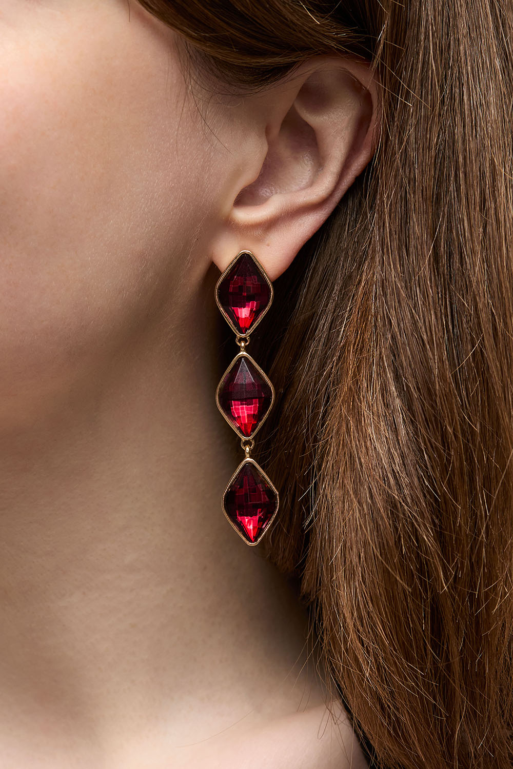 Øredobber i gullfarget metall med tre diamantformede hengende svarte glassteiner.