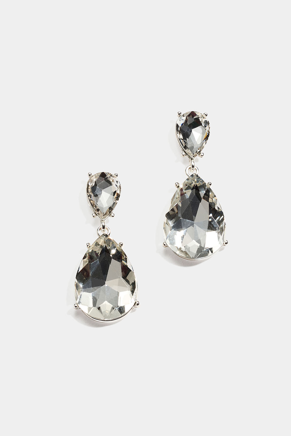 Øredobber i sølvfarget metall med en liten dråpeformet glasstein og en hengende stor dråpeformet glasstein.