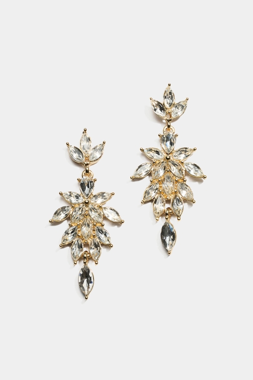 Øredobber i gullfarget metall med hvite dråpeformede glassteiner i klynge.