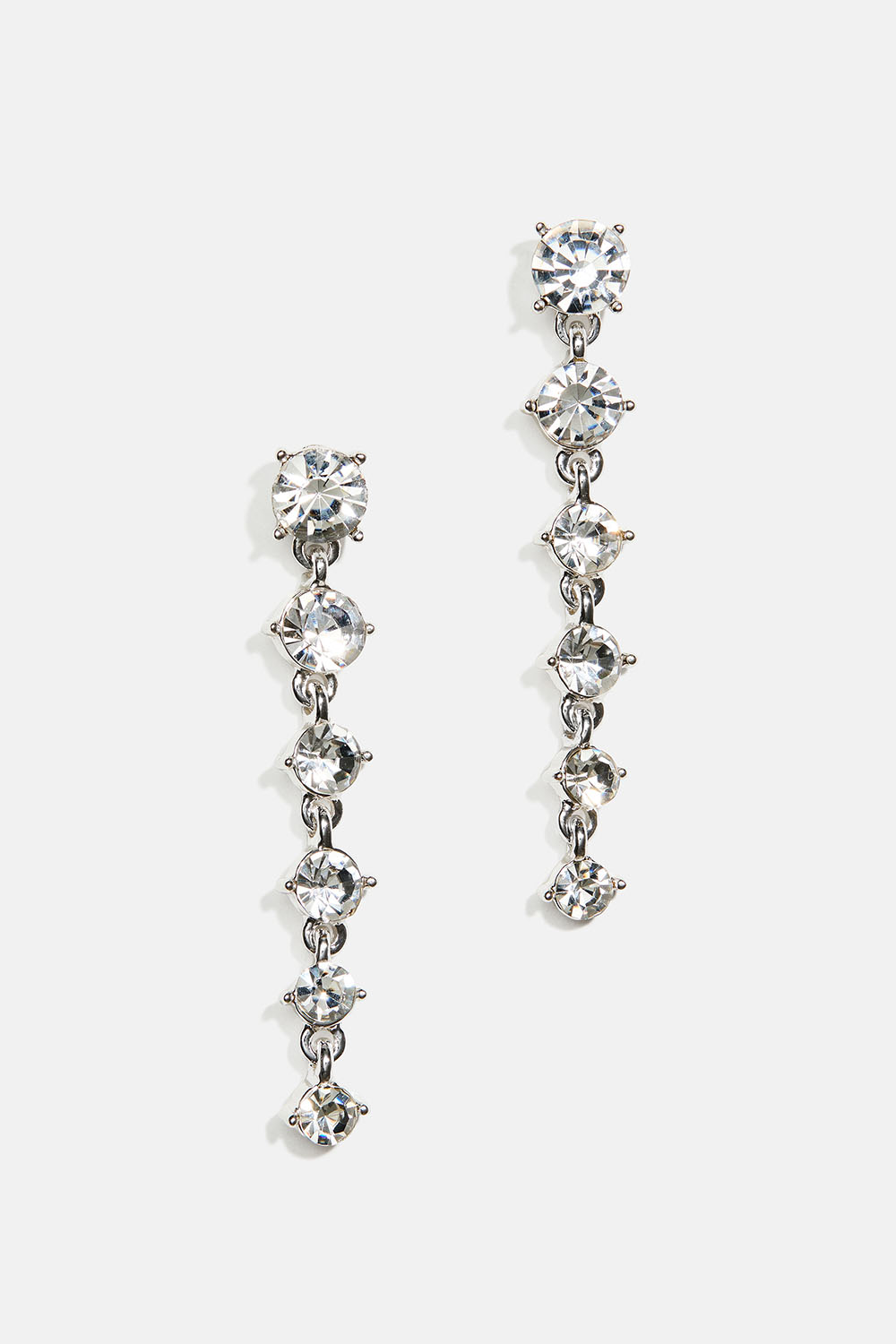 Sølvfargede øredobber i metall med runde, hvite glassteiner med ulike størrelser.