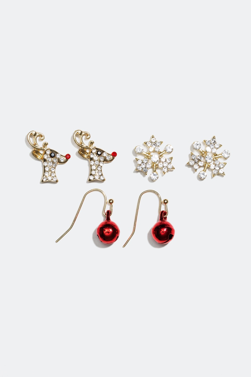 Tre juleinspirerte øredobber med motiver som et reinsdyr, snøkrystaller og små bjeller. Fine smykker til alle julens festligheter.