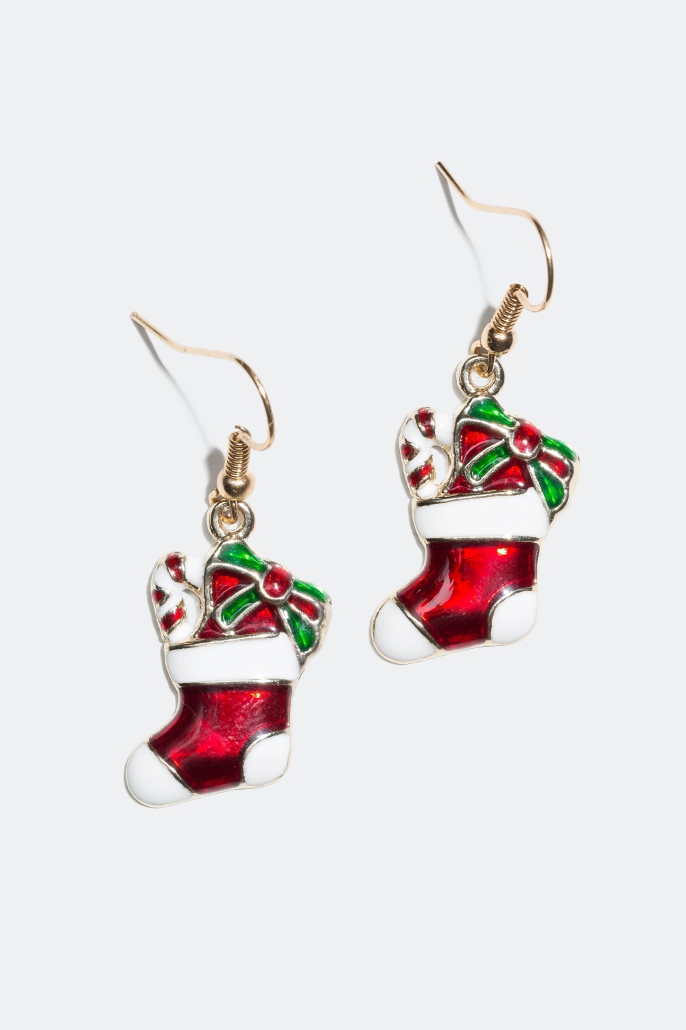 Øredobber med julestrømper - Morsomme øredobber til julfestene. Disse fine øredobbene er formet som julestrømper fylt med sløyfer og polkagriser.