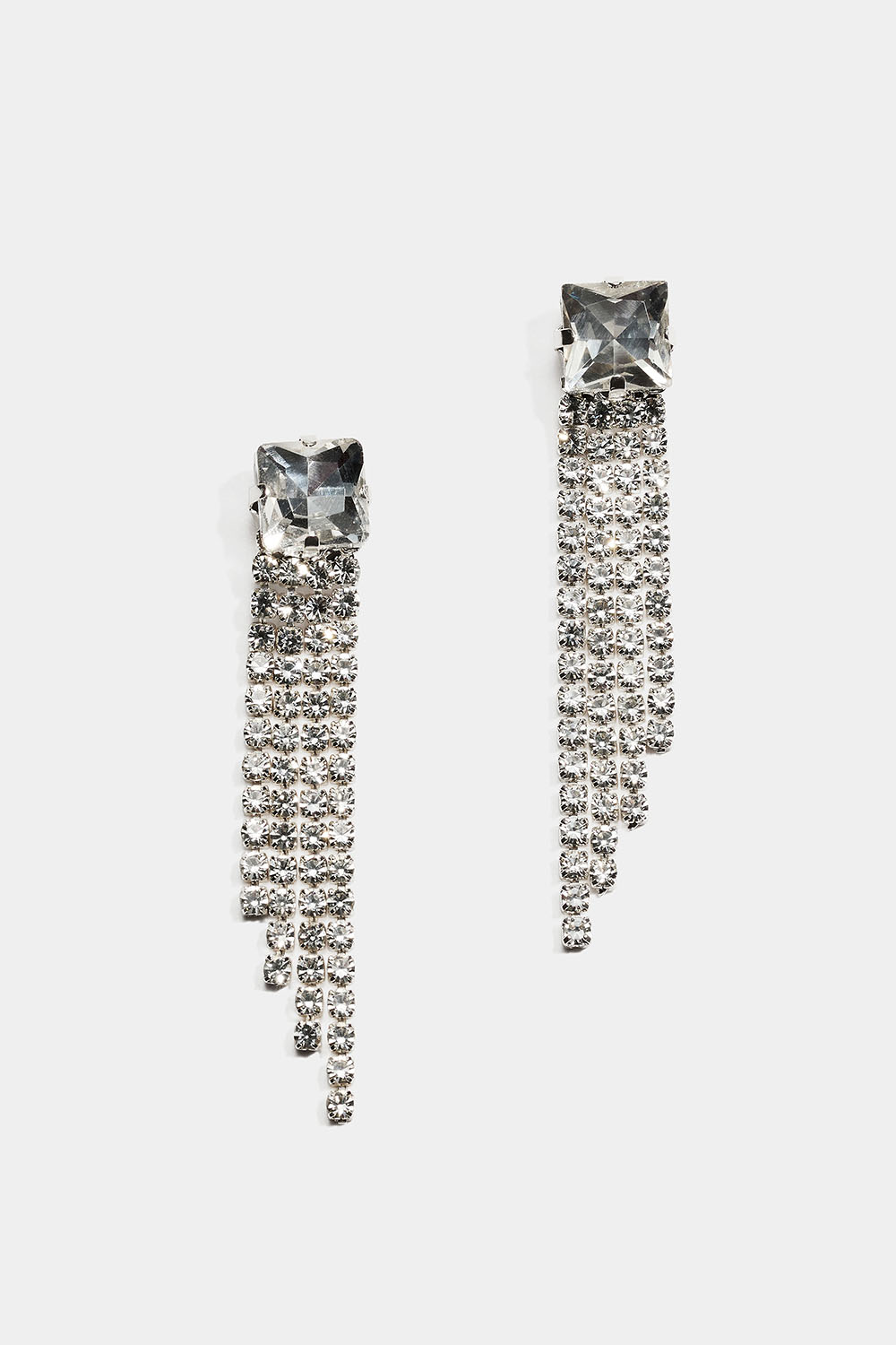 Øredobber med større rektangulære glassteiner og hengende strasslenker.