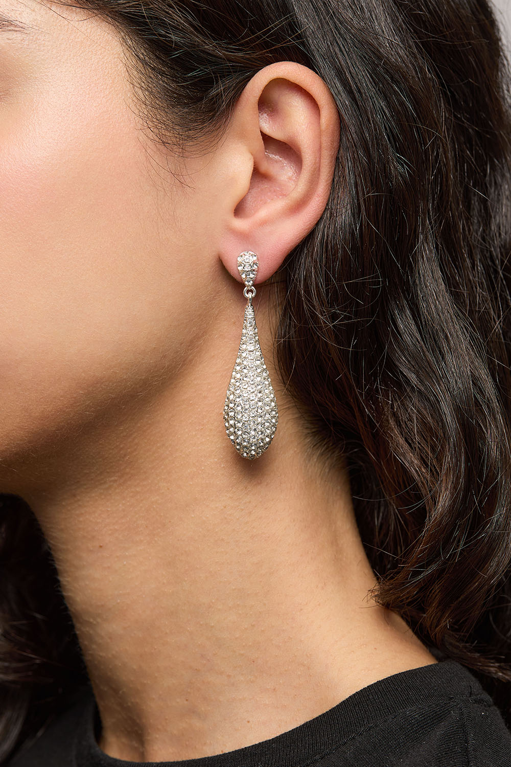 Øredobber i sølvfarget metall med en liten dråpeform og en lang hengende dråpeform dekorert med strass.
