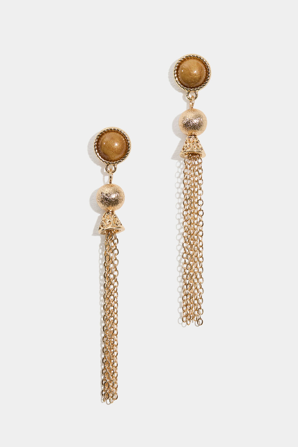 Lange øreringer med lysbrun perle og tråder i gullfarget metall.