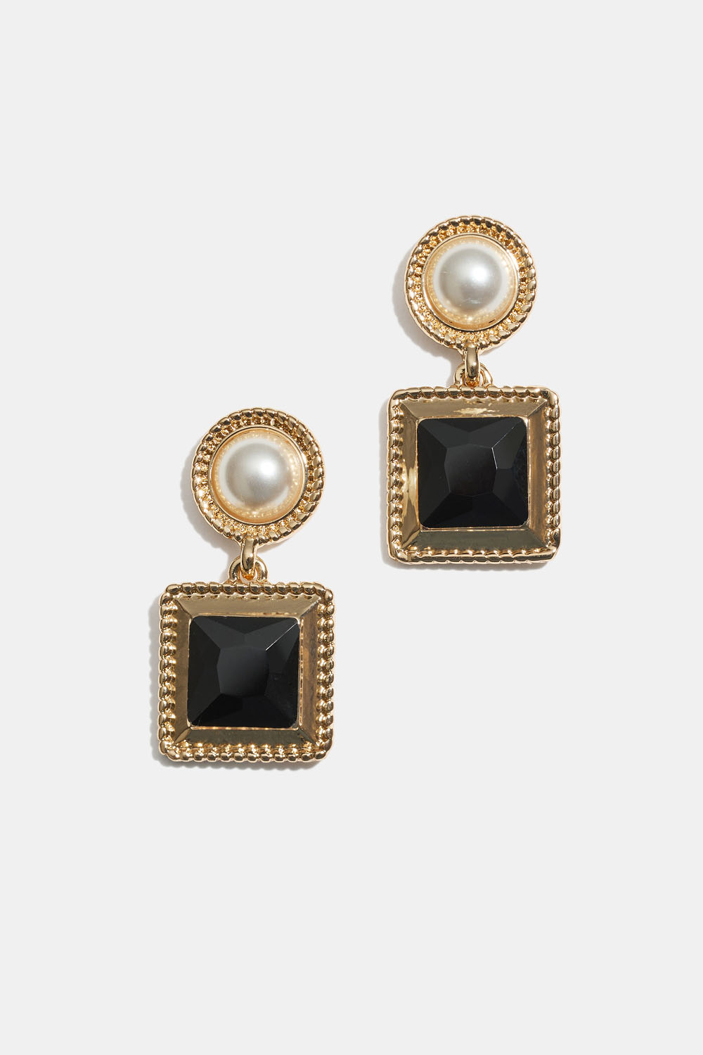 Gullfargede øredobber med en rund hvit perle og en hengende, firkantet, sort akrylperle