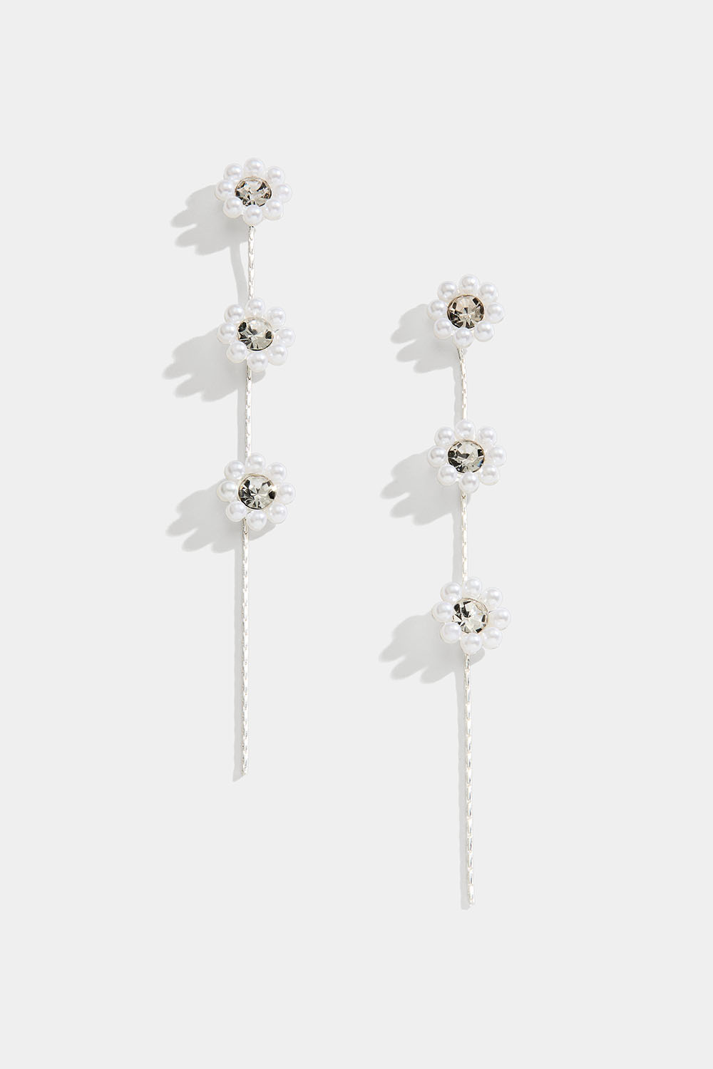 Lange øredobber i metall med 3 perleblomster og steiner.